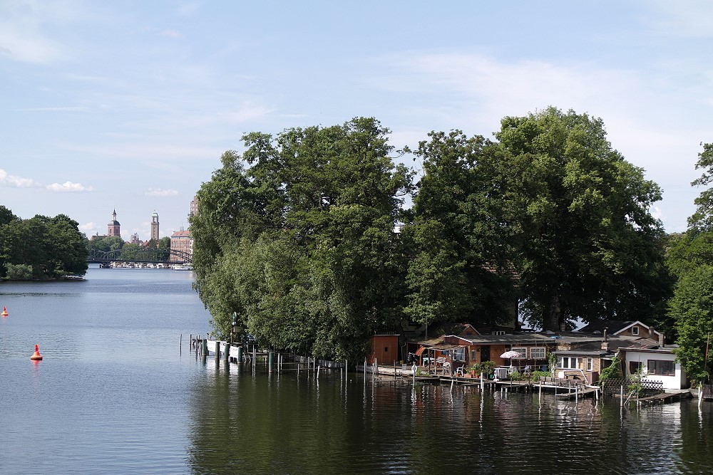 Im Vordergrund die Havel, im Hintergrund fließt die Spree zu.