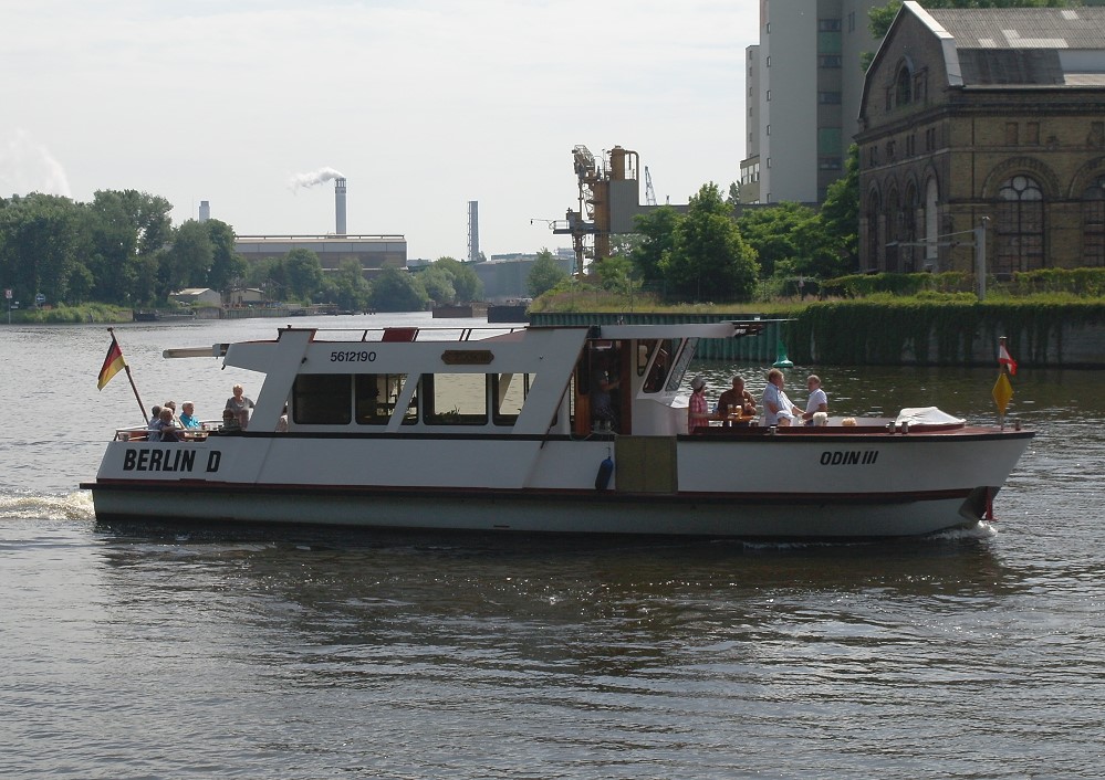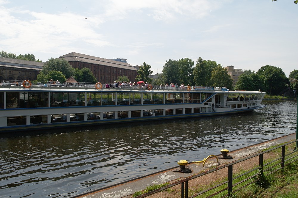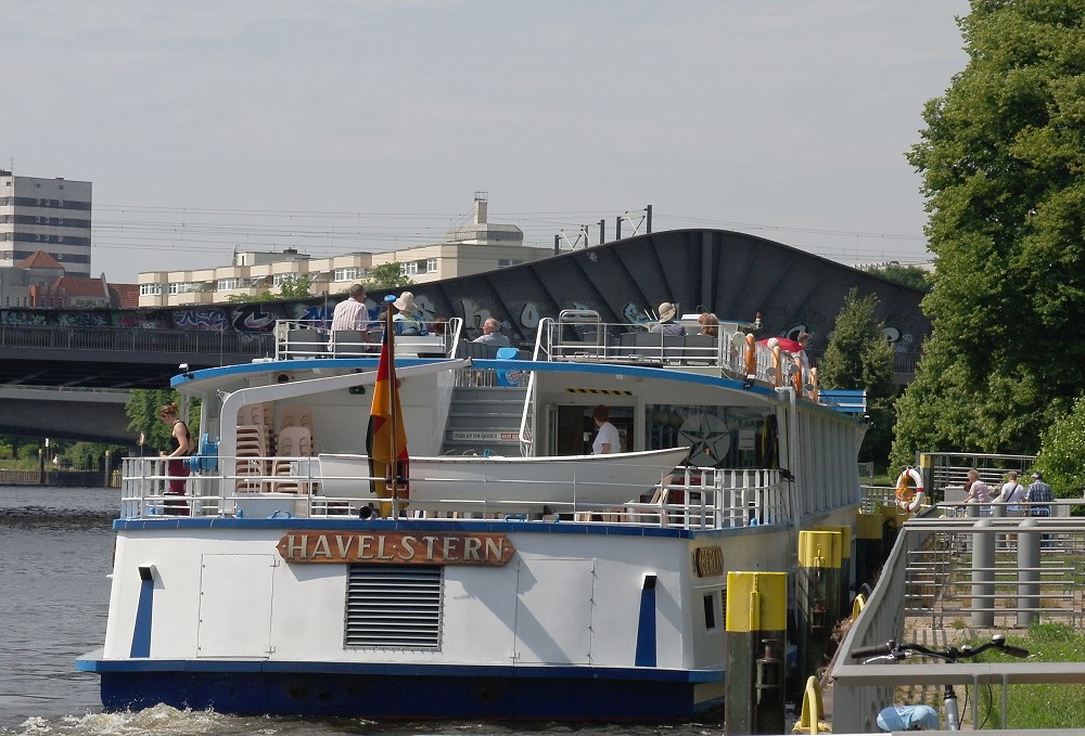 Die Berliner nennen das einen "Ausflugsdampfer", obwohl das Schiff keinen Dampfantrieb hat. Trotz Weitwinkel paßt das Schiff nicht komplett in das Bild... Zu sehen ist MS Havelstern