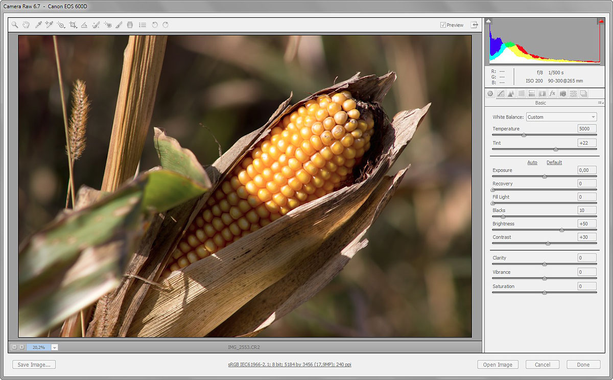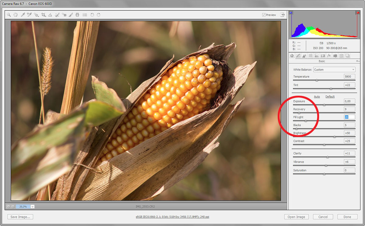 Zur Frage zum Aufhellblitz beim Maiskolben: Die Teleaufnahme ist nicht aufgeblitzt. Die Schatten wurden im RAW-Bild in Photoshop mit der Funktion "Fülllicht" aufgehellt. Siehe Screenshot aus dem RAW Converter. Auch die Farbe und die Durchzeichnung der Lichter wurde hier optimiert.