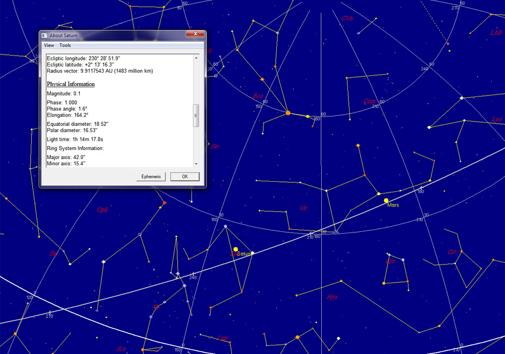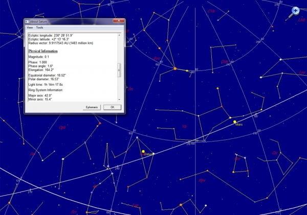 Der Saturn hat aktuell eine Helligkeit von 0,1 bei einem scheinbaren Durchmesser von 43 Bogensekunden. Entfernung von der Erde: ca. 9 AE = 1480 Millionen Km Screenshot aus dem Astro Programm Skymap