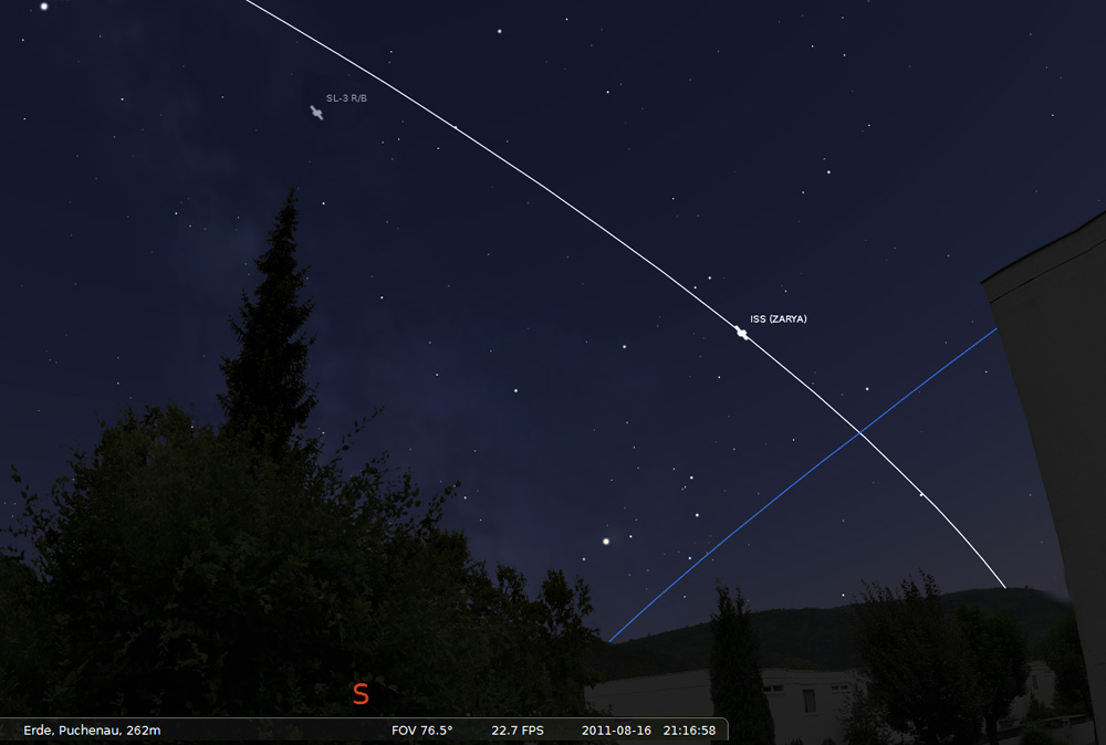Die blaue Satellitenbahn gehört zum Wettersatelliten NOAA 17, der noch durch das Haus verdeckt ist. Die Bahnspur von SL-3 R/B ist auf meiinem ISS-Photo oberhalb des Baumes ganz schwach erkennbar.