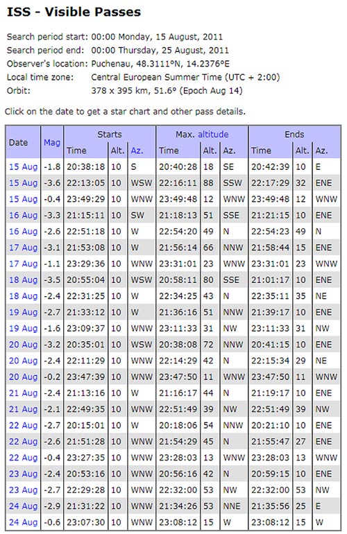 Zum leichteren Auffinden der Station sind im web genaue Tabellen zu finden: www.heavens-above.com Vorher die Koordinaten des Beobachtungsorte eingeben! Screenshot aus haevens-above