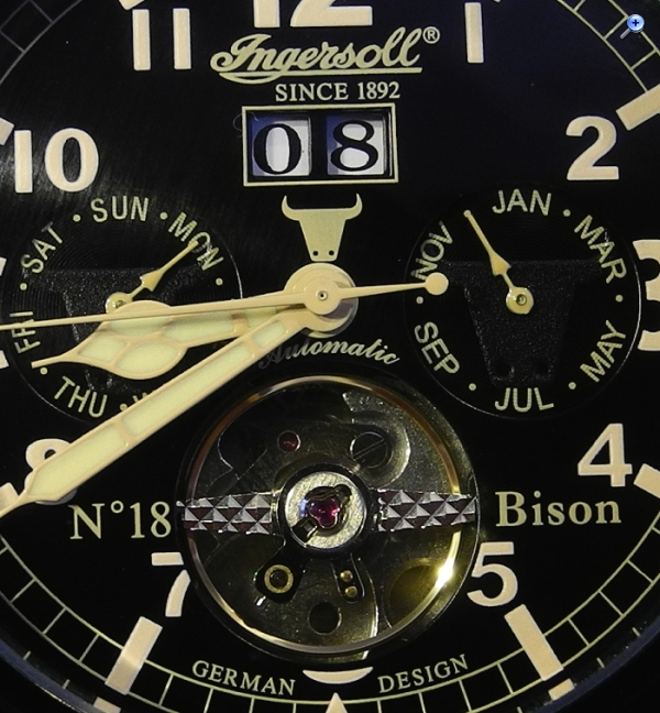 mal wieder eine Makroaufnahme: Das Motiv ist die mechanisch-automatische Herrenarmbanduhr Ingersoll Bison No.18. Diese Uhr hat die Anmutung eines Chronographen durch die beiden Drücker. Allerdings haben die Drücker tatsächlich eine andere Aufgabe: Der obere Drücker stellt das halbautomatische Zweiziffern-Datum einen Tag weiter (wichtig bei Monaten mit weniger als 31 Tage). Der untere Drücker stellt rein manuell den Monat ein Schritt weiter. An der linken Uhrenseite kann bei seltenem Bedarf der automatische Wochentag weitergesetzt werden.