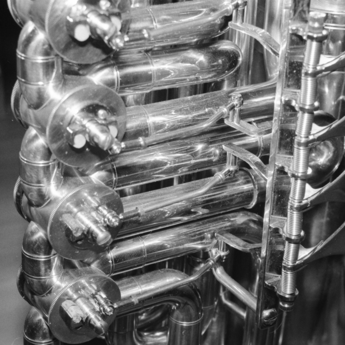 Zipferlak:Anbei ein Foto vom Ventilwerk meiner Tuba. .. Gerade bei technischen Detailaufnahmen hat der Schwarzweißfilm einen besonderen Reiz. Auch die recht kleine Tiefenschärfezone (Schärfentiefe?) des 80mm Objektivs der Rollei bei mittlerer Blende bietet interessante Gestaltungsmöglichkeiten.