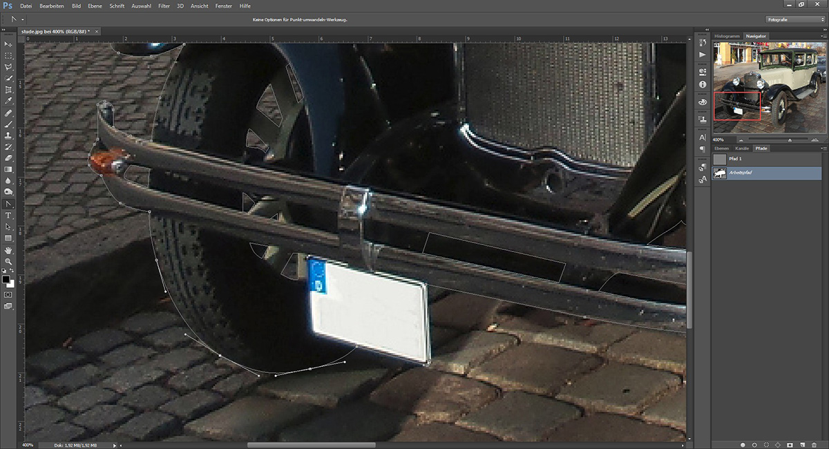Der Freistellpfad in Photoshop. Mit den Griffen an den Ankerpunkten kann die Vekorkurve nachträglich noch fein justiert werden. Unterpfade innerhalb des Arbeitspfades werden automatisch vom äußeren Pfad ausgespart.