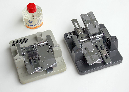 Die Klebepressen der Fa. Eumig für Normal 8mm und Superacht Filme ermöglichten durch den Keilschnitt fast unsichtbare und nach der Filmvertonung auch unhörbare Klebestellen.