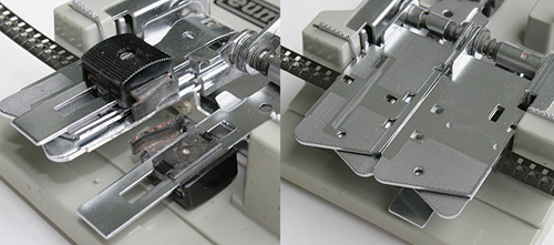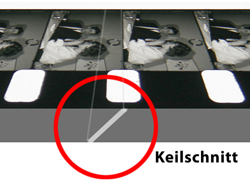 Aufklappen der rechten Hälfte der Presse, mit den keilförmigen Feilen werden die beiden Filmenden abgeschrägt.