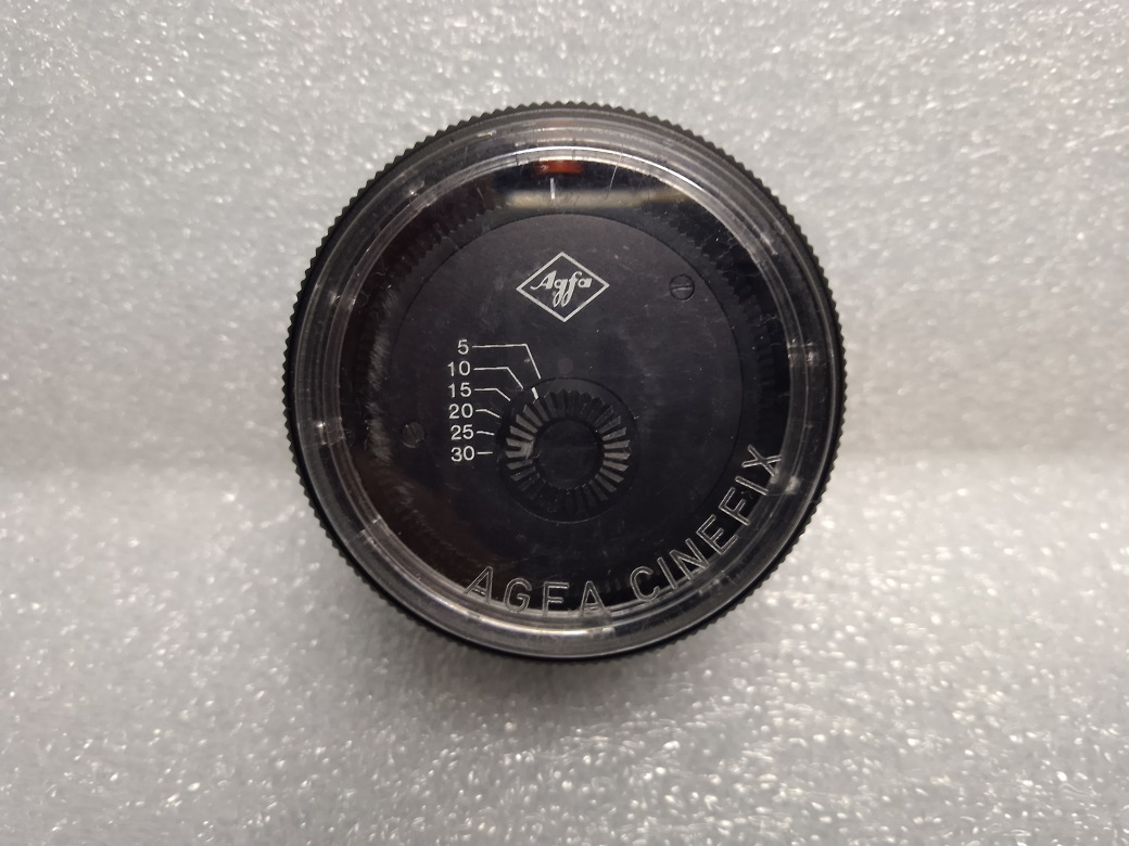 Hersteller: Agfa Modell: Agfa Cinefix Typ: Selbstauslöser für Super 8 Schmalfilmkameras mit ca. 10 Sekunden Vorlaufzeit, einstellbare Szenenlänge von 5 bis 30 Sekunden Baujahr: ab 1970 Neupreis (lt. Preisschild auf der Aufbewahrungsdose): 38,-- DM
