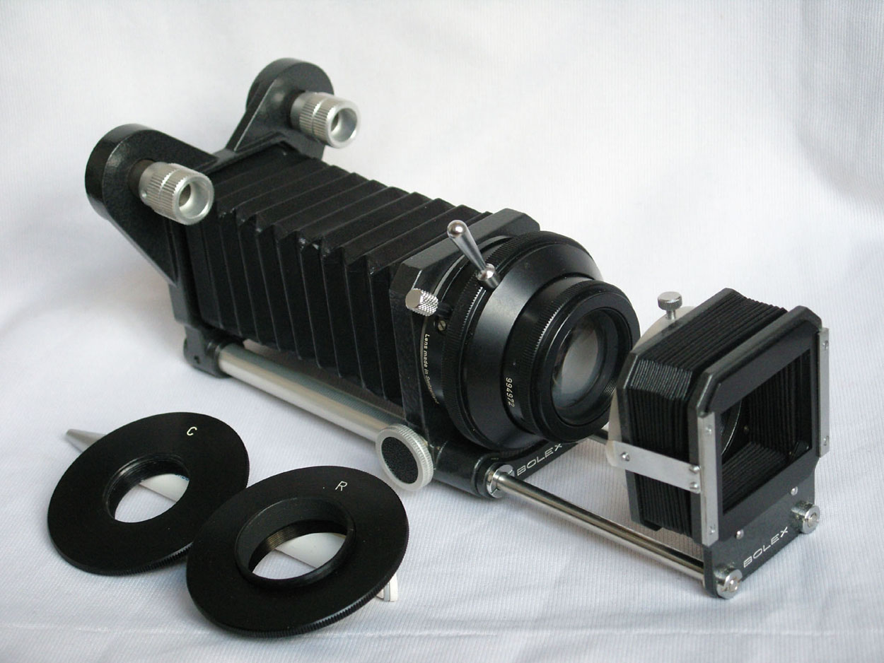 Nach meinen Unterlagen wurde das Balgengerät mit Kompendium von Novoflex 1966 für Bolex-Paillard für die H16 RX entwickelt. Das Kompendium ermöglichte neben Nahaufnahmen das Abfilmen von KB-Dias auf 16 mm Film. Das hintere Ende des Kompendiumbalgens wird mit der Klemmschraube am Objektiv befestigt. Die Adapterringe auf deinem Bild dienen zum Anschluß anderer Objektive (H16 = C-Mount). Dein Gerät sieht ja absolut neuwertig aus, ein schönes Stück.