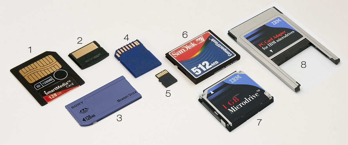 1 Smart Media 3,3 V (Die 5V Type hat die abgeschrägte Ecke an der linken Seite) 2 XD Card (von Olympus und Fuji verwendet) 3 Memory Stick (Sony) 4 SD Card 5 Micro SD Card (Bildspeicher im Handy) 6 CF Card 7 Microdrive (1" Festplatte) 8 PC Card Adapter für Microdrive (PC Card Format für PCMCIA Slots)