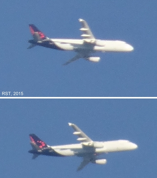 Es gibt also auch eine halbautomatische und manuelle Fokussierung. Ich habe dann auch voll unendlich gestellt und die folgenden Aufnahmen gemacht. Da sind dann schon bessere Aufnahmen entstanden. Das erste Bild zeigt Flugzeuge in ca. 10000 Meter Höhe 45 Grad über mir, die zweite Aufnahme eine Maschine in ca. 3000 Meter.