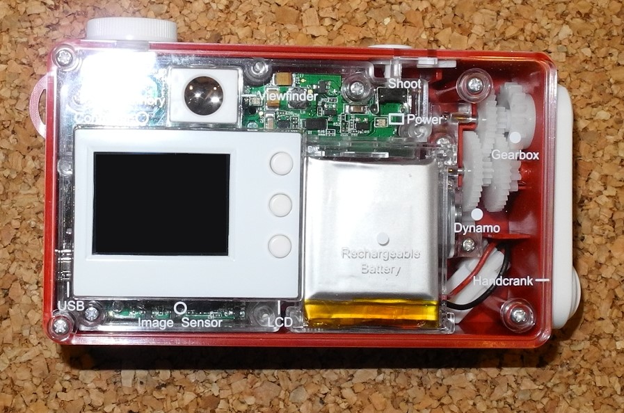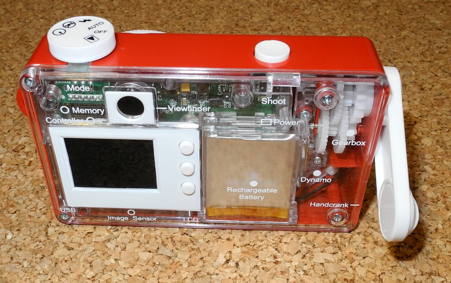 der Bausatz wird u.a. von Conrad angeboten. Es handelt sich um eine Digitalkamera, die der Käufer zusammenbauen muß. Das eigentliche Kamera-Modul ist eine komplette Einheit. Als unbedingte Besonderheit ist der eingebaute Dynamo zu nennen, mit einer Handkurbel kann man den Akku nachladen. Das reicht bei einer Minute kurbeln schon für die nächsten Aufnahmen.