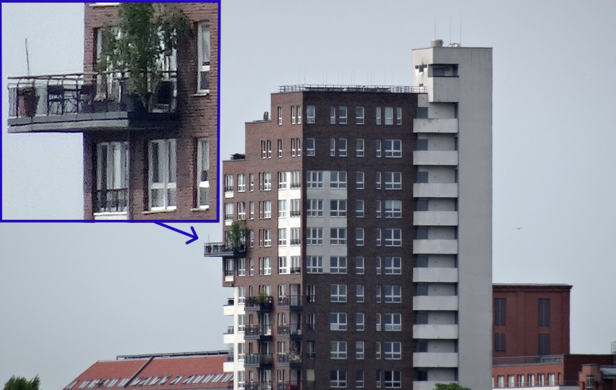 Das folgende Motiv war 1,5 km entfernt. Der reinkopierte Ausschnitt ist 1:1. Man erkennt, dass die Kamera herumgerechnet hat, aber auch die Wirkung der Luftunruhe ist erkennbar. Trotzdem ist das Hauptfoto immer noch gut verwendbar.