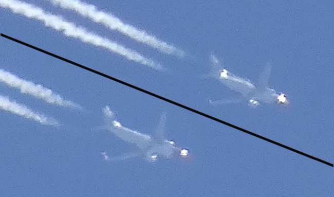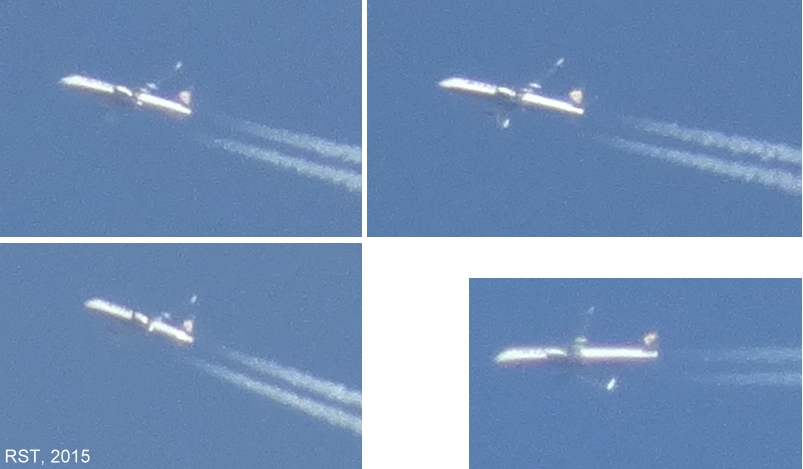 Es gibt also auch eine halbautomatische und manuelle Fokussierung. Ich habe dann auch voll unendlich gestellt und die folgenden Aufnahmen gemacht. Da sind dann schon bessere Aufnahmen entstanden. Das erste Bild zeigt Flugzeuge in ca. 10000 Meter Höhe 45 Grad über mir, die zweite Aufnahme eine Maschine in ca. 3000 Meter.