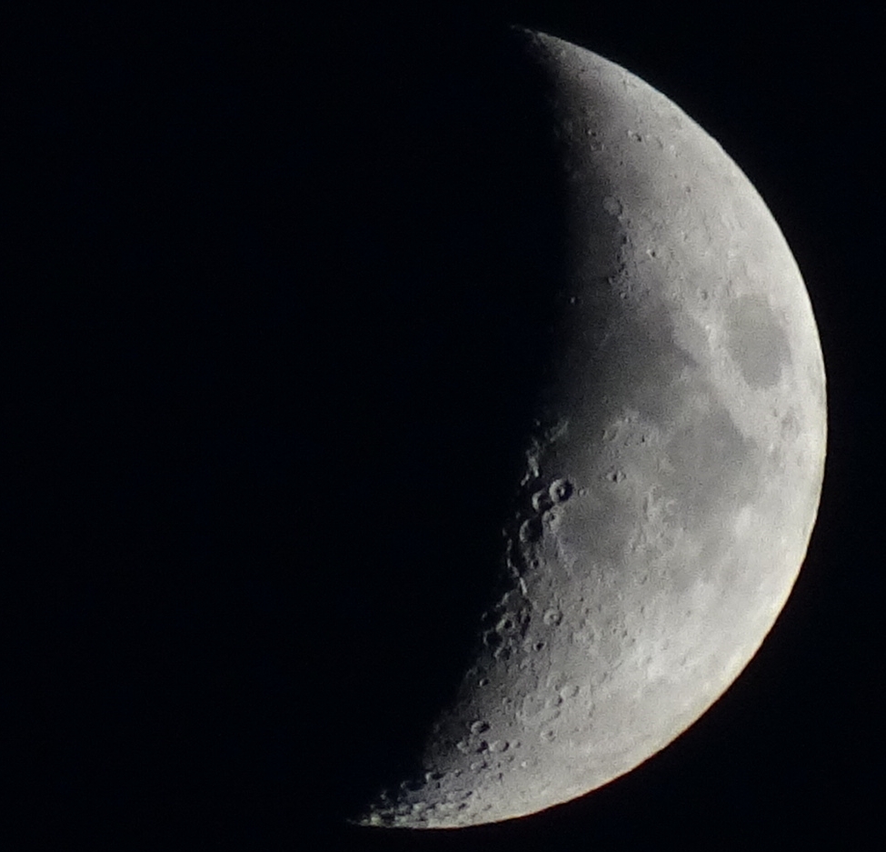 Durch das seitliche Streiflicht kommen die Krater gut heraus, auch am rechten Mondrand sind die "Berge" als Unregelmäßigkeit des Kreisrandes gut erkennbar.
