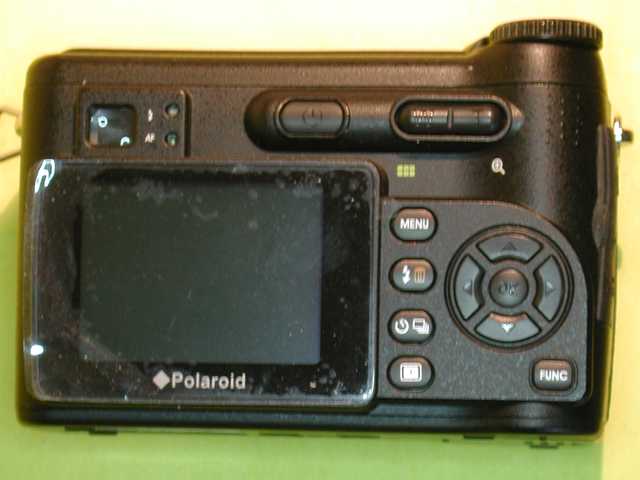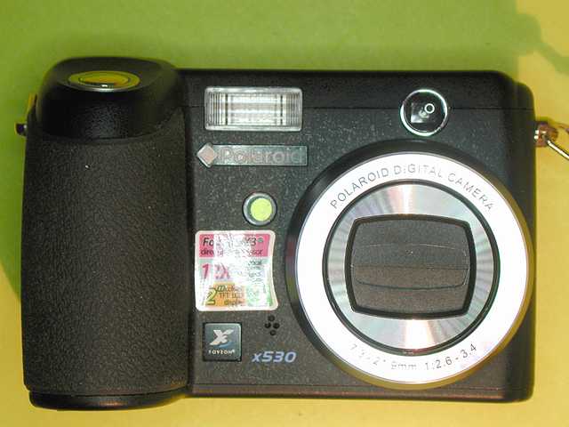 Hersteller, Modell: World Wide License Ltd., Hong Kong, Polaroid X530 Baujahr: 2004 Chip-Format: 1/1.8 Zoll Bildgröße: bis 1419 x 1057 Pixel. Objektiv: 7.3 - 21.9 mm, Blende 2.6 - 3.4 (Kleinbild-äquivalent 35-107mm) Makro: ab 1 Zentimeter Aufnahmen / Speichergrösse: SD-Karten-Varianten ASA: 100-400 manuell wählbar Verschluss: bis 1/1000 Sek. Belichtungssystem: Programmautomatik, Belichtungskorrektur +- zwei Lichtwerte Belichtungsmessung: Mittenbetonte Integralmessung, Matrix/Mehrfeld-Messung, Spotmessung Blitz: fest eingebaut, kein Hotshoe, kein externer Anschluß Display: 2 Zoll TFT-LC Sucher: ja, optischer Durchsichtssucher ohne Dioptrien-Ausgleich Entfernungsmessung: Einzel-Autofokus, kontinuierlicher Autofokus Selbstauslöser: ja Video: 640x480@30fps Audio: ja. Mikrophon für Video Datentransfer: USB Speicherkarte: SD Bildstabilisator: nein Batterie / Akku: LI Akku , Typ XB903874 Stativgewinde: 1/4 Zoll in Kunststoff, Querformat, unter dem Schwerpunkt der Kamera.