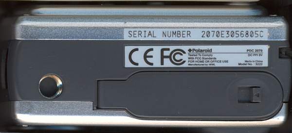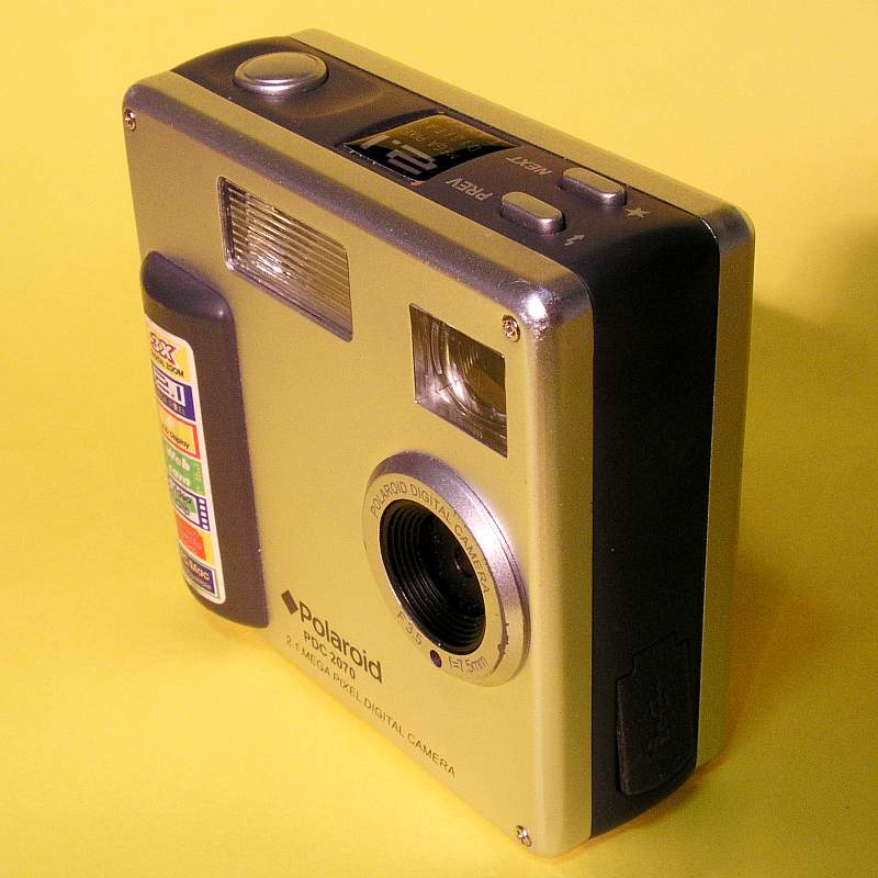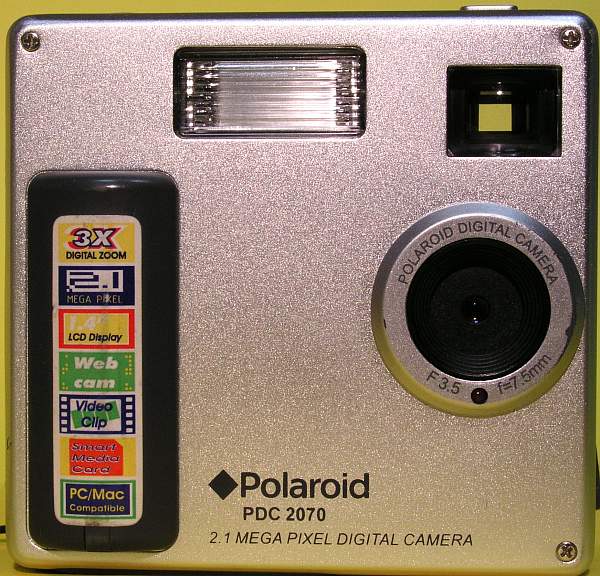 Hersteller, Modell: WWL (World Wide Licenses) aus Hongkong, Polaroid PDC2070 Baujahr: 2003 oder früher Sensor: CMOS 1/2 Zoll, 2.1 Megapixel Bildgröße: bis 1600x1200 Pixel Objektiv: Fixfocus, Brennweite 7.5mm, F=3.5 Display: LCD Farbdisplay 3.6 cm Sucher: Durchsichtssucher Stromversorgung: 4x aaa Blitz: ja Video: 320 × 240 Pixel, 10 Bilder/sec. Speicher: interner Speicher 8MB und SmartMedia Karte Sonstige Features: Belichtungsautomatik, Weißabgleich, Selbstauslöser, Tonaufnahme WAV 30min auf dem internen Speicher, Datum/Uhrzeit Stativanschluß: Metall Gewicht: 170gr Abmessungen: ca. 75 x 75 x 33 mm