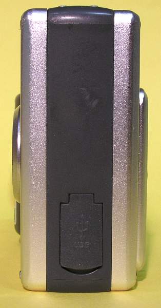 Hier die andere Seite mit dem USB-Anschluß. Man sieht auch sehr schön, daß das Objektiv nicht hinderlich herausragt und sogar taschenfreundlich abgeschrägt ist.