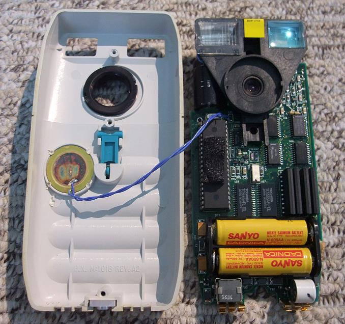 Unten rechts sind die beiden gelben Akkus zu sehen, darunter die Firmware-Stützbatterie (wird wahrscheinlich 10 - 20 Jahre halten). Danach wird die Kamera unbrauchbar, wenn nicht ohne Spannungsverlust diese Batterie gewechselt werden kann.Rechts oberhalb der Akkus die vier Speicher-Chips (4 MB). Links vom Objektiv der Lade-Elektrolyt-Kondensator der Blitz-Einheit. Links in der Gehäuseskala der Piezo-Signalgeber.
