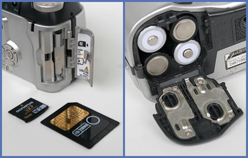 In den Kartenslot der Kamera passen wahlweise SM oder XD Karten. Durch die Verwendungsmöglichkeit von Alkalibatterien, die in jedem Dorfladen erhältlich sind, ist die Stromversorgung der Kamera auch abseits jeder Lademöglichkeit immer gegeben.