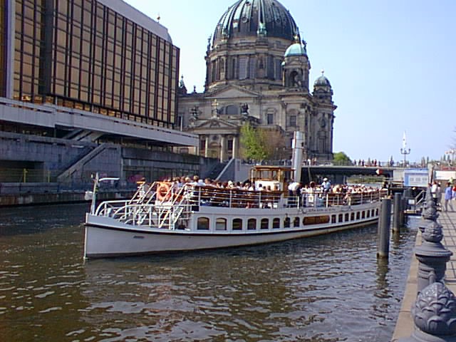 Zu sehen ist ein Berliner "Ausflugsdampfer" vor dem ehemaligen Palast der Republik (DDR).