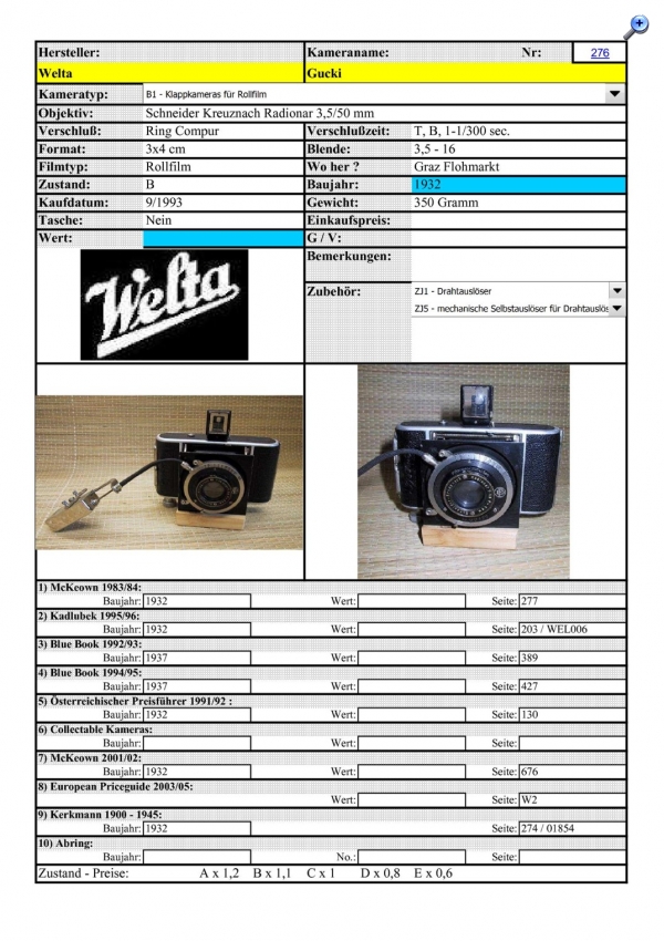 Anmerkungen: Prägung 'Gucki' an Gehäusevorderseite, Prägung 'Welta' am angelenkten Rückteil, Gehäusekanten Leichtmetall, Neupreis in dieser Ausstattung 63,50 RM (1931)
