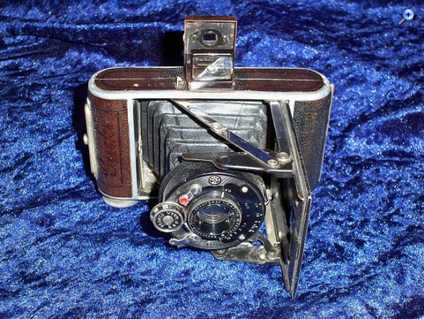 habe heute mal wieder eine kleine Inventur gemacht und bin über meine Welta Gucki gestolpert. Es handelt sich dabei um die mit dem Aufnahmeformat 4x6,5 auf 127´er. Als Verschluss kam ein Pronto von Gauthier zum Einsatz, die Optik ist ein Rodenstock Trinar-Anastigmat 4,5/70. Nettes Detail ist dass bei der Betätigung des Öffnungsknopfes sowohl die Grundplatte, als auch der Sucher aufklappt. Der Sucher lässt sich nur bei geschlossener Kamera arretieren. Den Zustand würde ich mit "richtig schön abgerockt" betiteln, wobei die braunfärbung des abgeriebenen Leders einen gewissen Reiz hat.