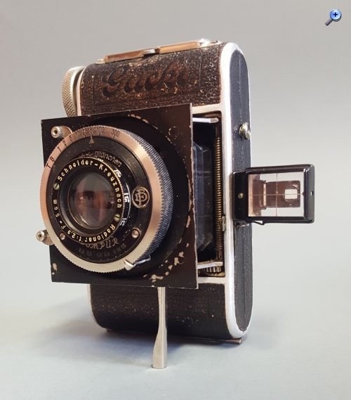sehr schön! Besonders skurril an der Gucki finde ich den Sucher mit Fadenkreuz, der besondere Präzision suggeriert... Ich stelle noch eine weitere Variante dazu, die Gucki mit dem lichtstarken Schneider Xenon 2/4,5 mit Gesamtverstellung. Interessanterweise wurde hier auf den Präzisionssucher verzichtet. Diese Variante wird im Netz gelegentlich erwähnt; ein weiteres Exemplar ist in einem Aufsatz von Jost Simon in Photographica Cabinett 27 (2001) dokumentiert.