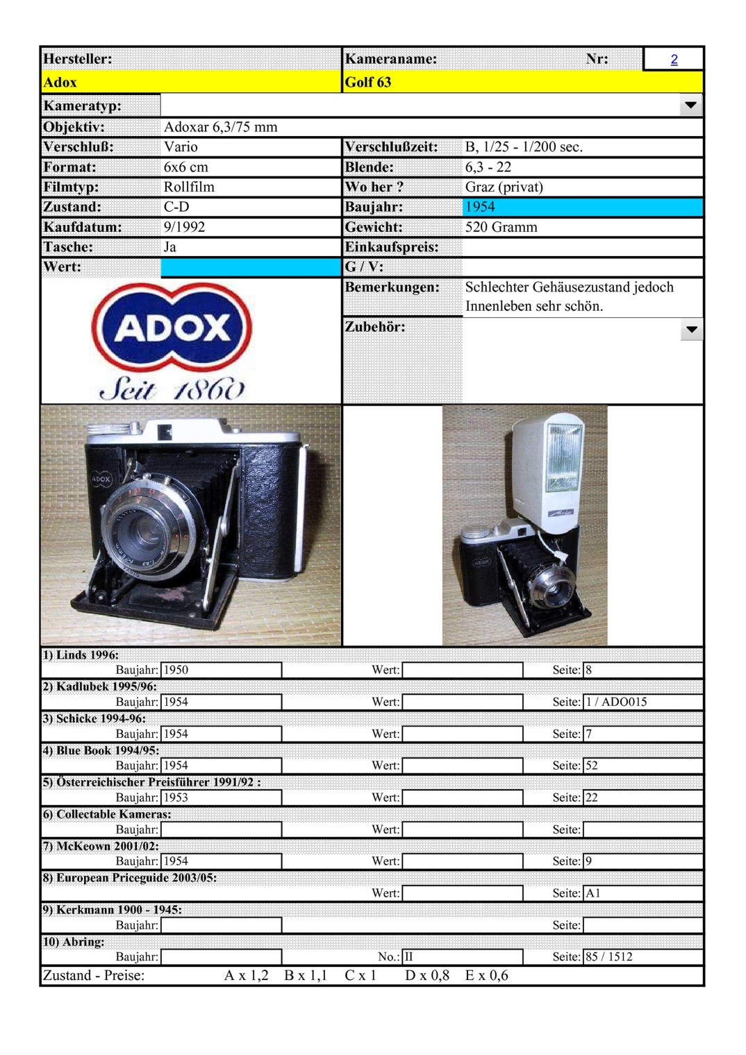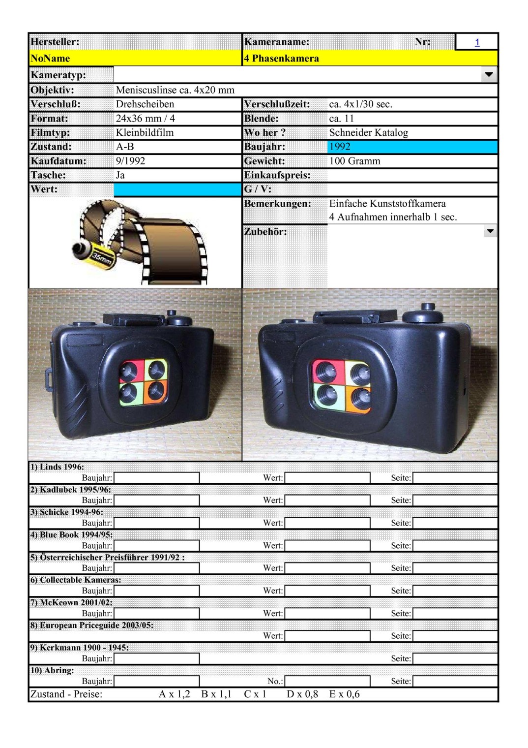 möchte euch meine Ansammlung an Daten nicht vorenthalten. Sollte es Fragen zu den einzelnen Spalten geben, bitte melden. Denke aber das ist selbsterklärend. Ich werde nach und nach beliebeige Kameras einfügen (bei mir nach laufender Nummer, weil es für mich einfacher ist). Die Nummer hat kein System dahinter (wird immer dann vergeben, wenn die entsprechende Kamera in die Datenbank aufgenommen wird). Ich habe seinerzeit einmal Zustandsklassen festgelegt (A-E). Ich weiß dass es mittlerweile andere Systeme dafür gibt, wollte aber dann mein System nicht mehr ändern. Zustand A = Neuwertig, Zustand E = "fast Schrott".