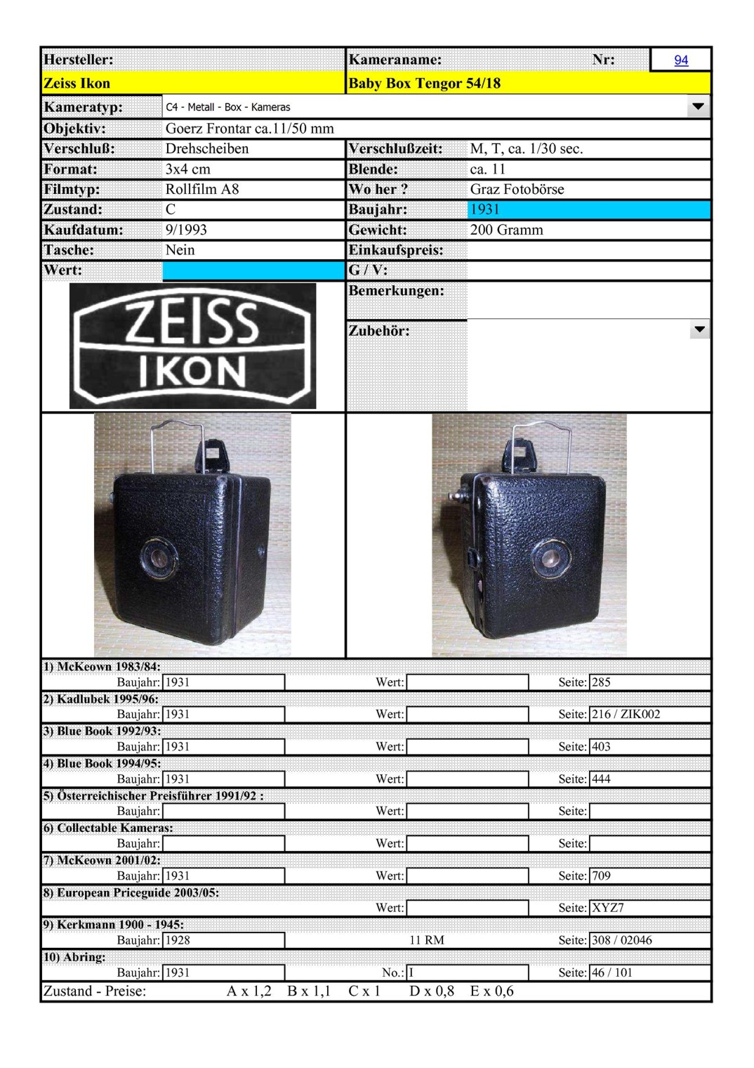 Mir fehlen hauptsächlich die erwähte 54/18E (die ich übrigens aus Österreich von etwa 1 Monat füe relativ wenig Geld nicht gekauft habe und die aller erste Box Tengor von Goerz. Die ist mir immer zu teuer. Ich habe aber geduld...für die Baby-Boxen wird meistens über 30€ verlangt (in Internet und Flöhmärkte). Ich habe aber meine beide Exemplare für je 6€ gekauft