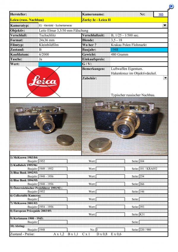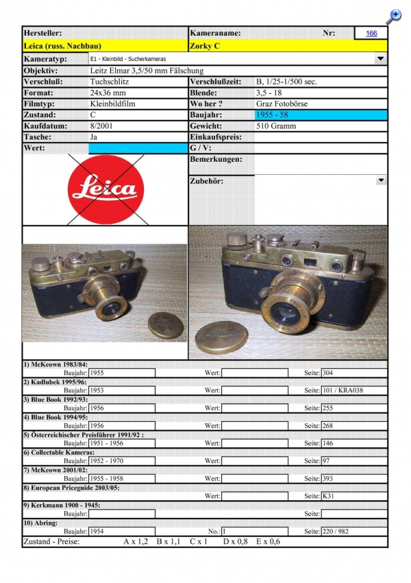 es ist interessant hier zu bemerken, dass beim ersten Exemplar sich um eine Zorki 1 (Modell B) handelt (1949-1951) wo zum ersten mal die Gewinde für Drahtauslöser an einem Leica-Nachbau angebracht wurde (Sogar FED würde es nicht bis zum 1953 einführen, beim Modell IG). Die Ertsen Zorkis hatten am Anfang den "Leica" Auslöser.