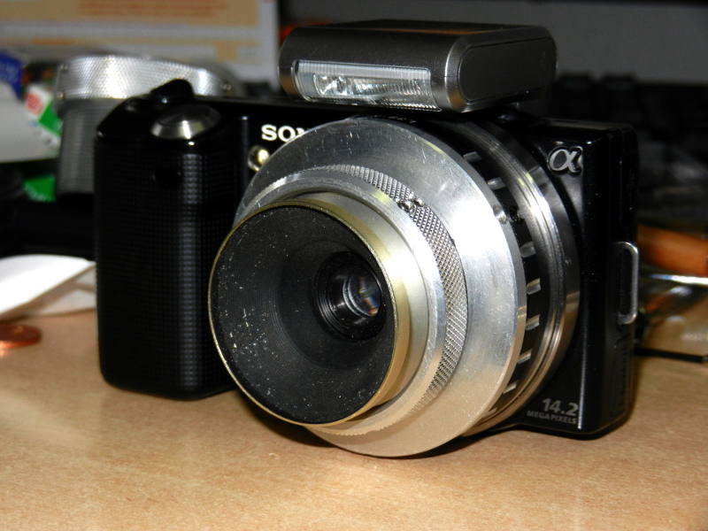 Ich habe auch mal aus einer defekten Penti II mit dem "Bolzenschneider" das Domiplan herausoperiert und an die NEX drangebastelt. Das Objektiv macht auch digital angenehme Bilder. Das sieht an der NEX dann wie folgt aus:
