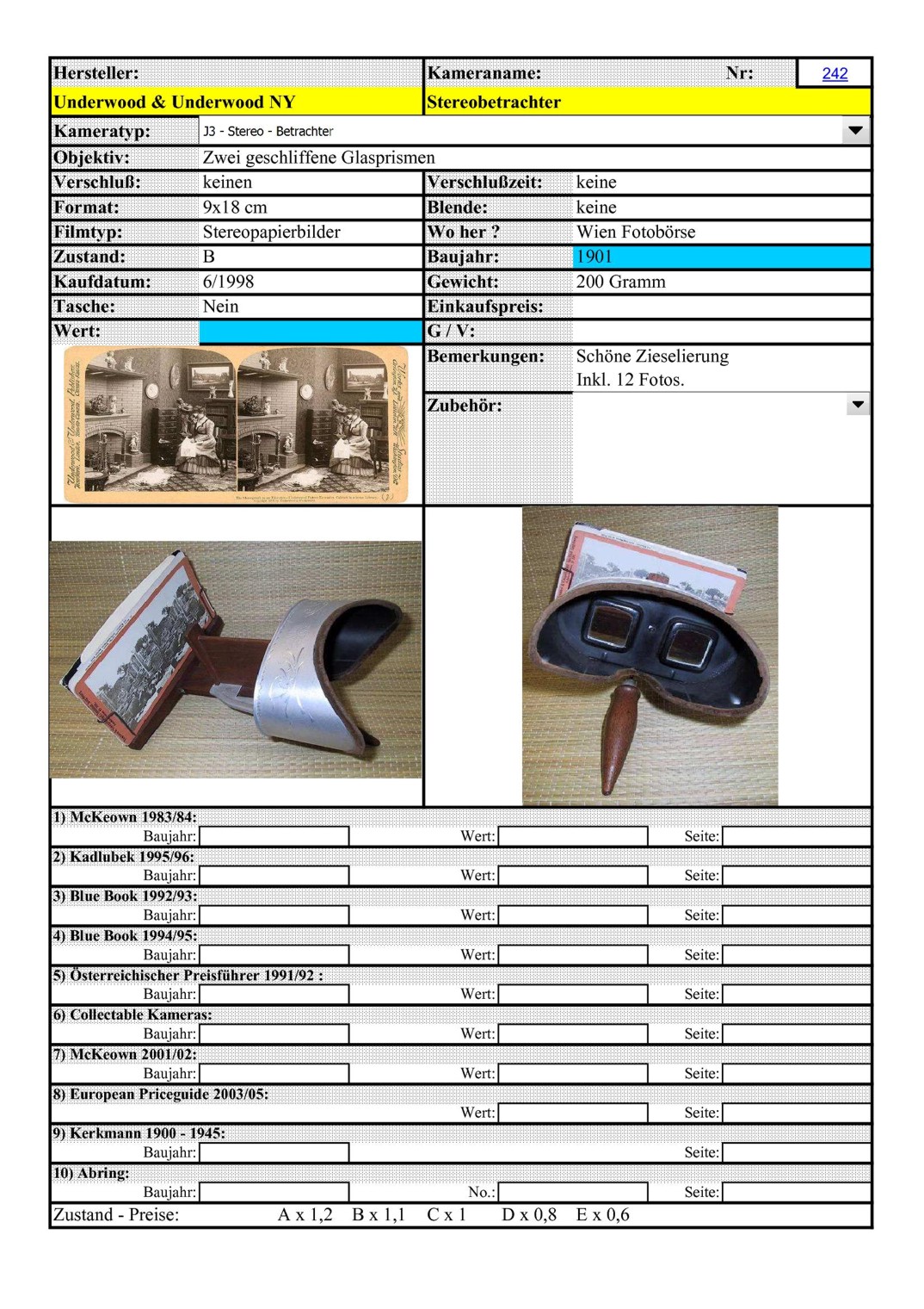 ich liebe diese alten Stereo-Betrachter. Mein Großvater hatte als junger Mensch (so um 1900 herum) von seinem Onkel einen solchen Betrachter geschenkt bekommen. Dabei war eine Bildserie aus Pommern (heute Polen) mit einigen 3D-Papierbildern aus Pyritz (der Heimatstadt meines Großvaters). Für ihn waren das die einzigen Photos seiner Heimatstadt, da man damals üblicherweise kaum einen eigenen Photoapparat hatte. Bilder wurden noch zumeist beim richtigen Photographen gemacht und das waren dann die berühmten Starr-Bilder (wegen der langen Belichtungszeit).