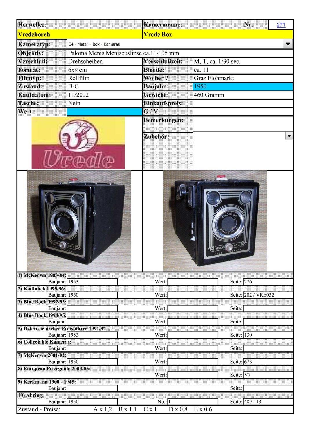 Dein Exemplar ist übrigens das Modell "Paloma" (wie im Objektiv bemerkt). Andere Modelle der Reihe waren das Basismodell "Vrede-Box" und die "Syncrona" (Standard und Optomax) mit Blitzbuchse. Auch die Paloma bekam eine Blitzbuchse und wurde zu "Paloma-S".