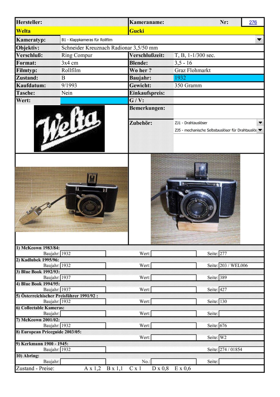 Anmerkungen: Prägung 'Gucki' an Gehäusevorderseite, Prägung 'Welta' am angelenkten Rückteil, Gehäusekanten Leichtmetall, Neupreis in dieser Ausstattung 63,50 RM (1931)