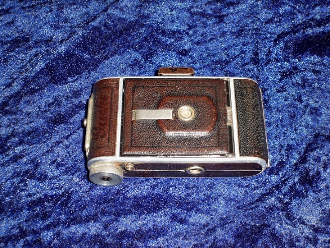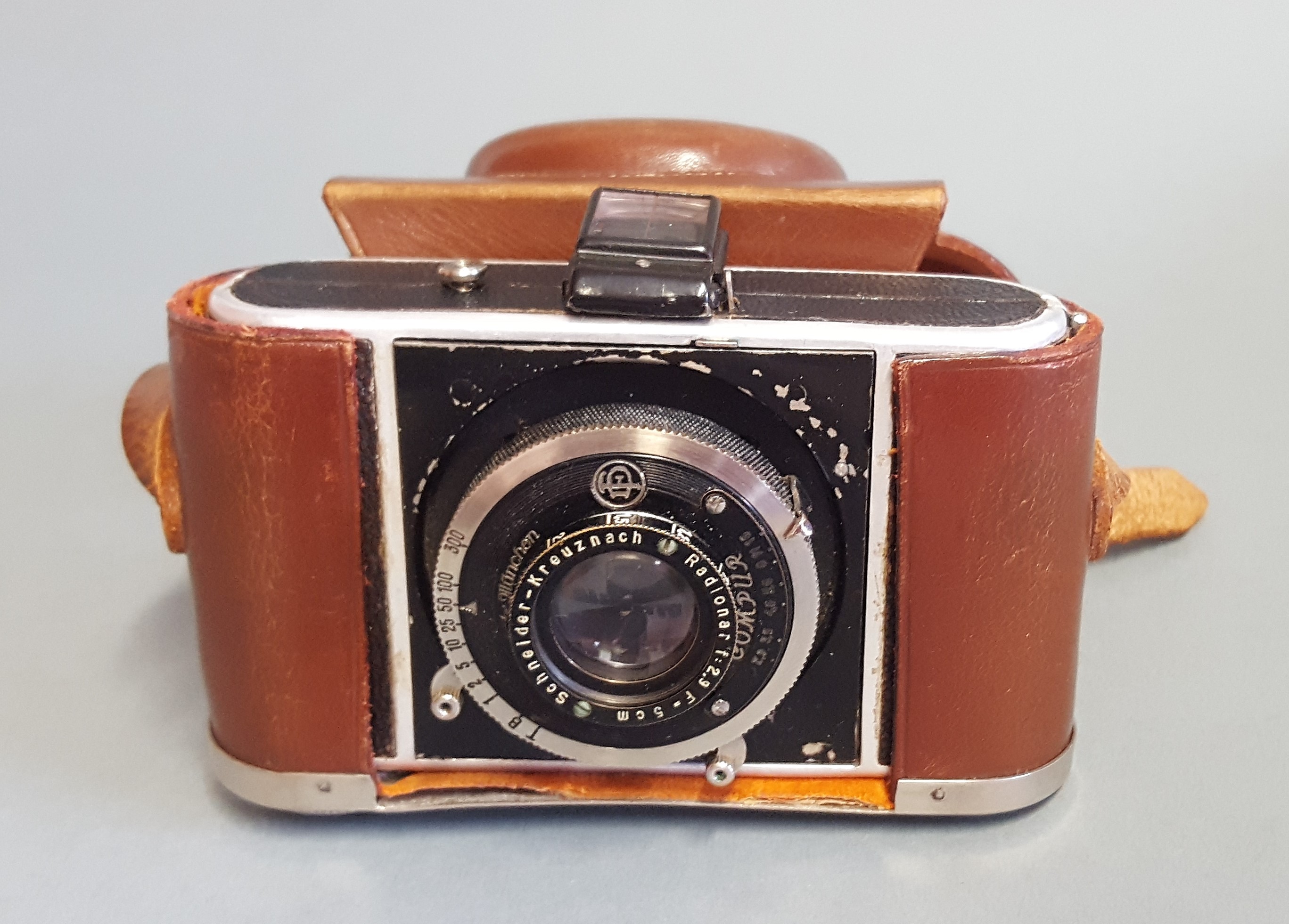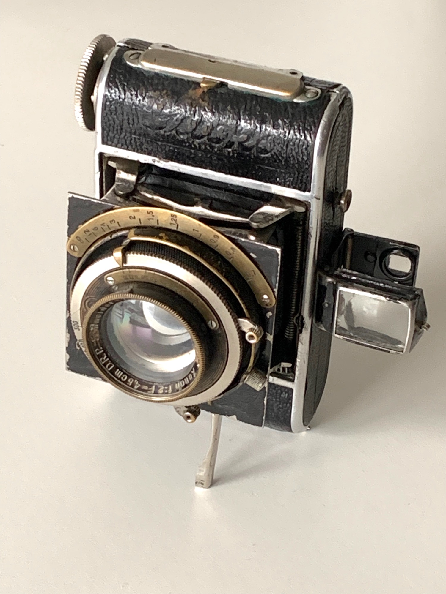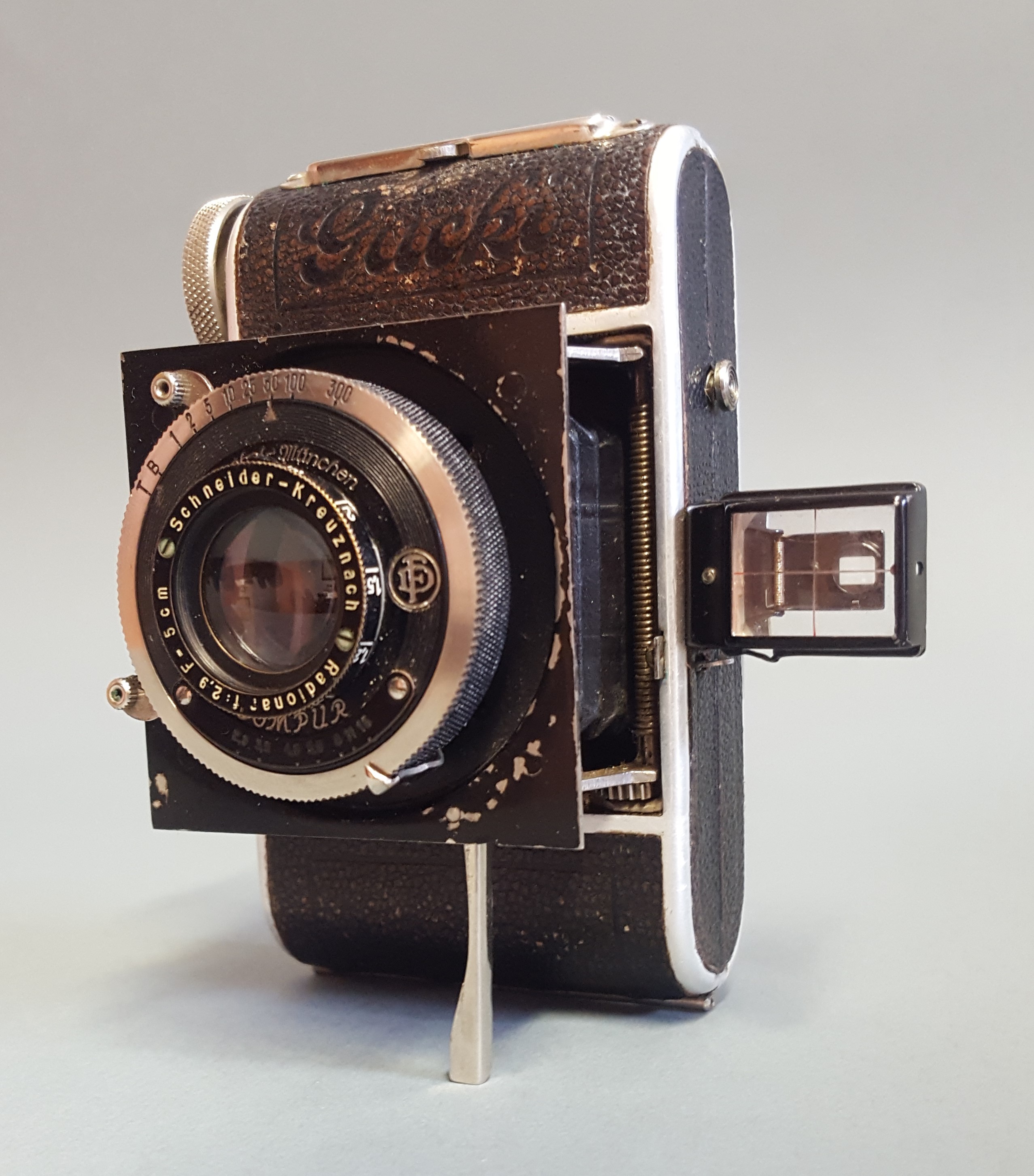 sehr schön! Besonders skurril an der Gucki finde ich den Sucher mit Fadenkreuz, der besondere Präzision suggeriert... Ich stelle noch eine weitere Variante dazu, die Gucki mit dem lichtstarken Schneider Xenon 2/4,5 mit Gesamtverstellung. Interessanterweise wurde hier auf den Präzisionssucher verzichtet. Diese Variante wird im Netz gelegentlich erwähnt; ein weiteres Exemplar ist in einem Aufsatz von Jost Simon in Photographica Cabinett 27 (2001) dokumentiert.
