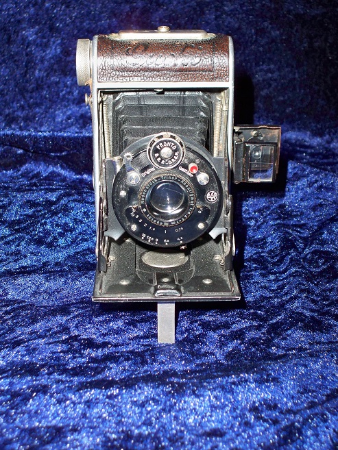 habe heute mal wieder eine kleine Inventur gemacht und bin über meine Welta Gucki gestolpert. Es handelt sich dabei um die mit dem Aufnahmeformat 4x6,5 auf 127´er. Als Verschluss kam ein Pronto von Gauthier zum Einsatz, die Optik ist ein Rodenstock Trinar-Anastigmat 4,5/70. Nettes Detail ist dass bei der Betätigung des Öffnungsknopfes sowohl die Grundplatte, als auch der Sucher aufklappt. Der Sucher lässt sich nur bei geschlossener Kamera arretieren. Den Zustand würde ich mit "richtig schön abgerockt" betiteln, wobei die braunfärbung des abgeriebenen Leders einen gewissen Reiz hat.