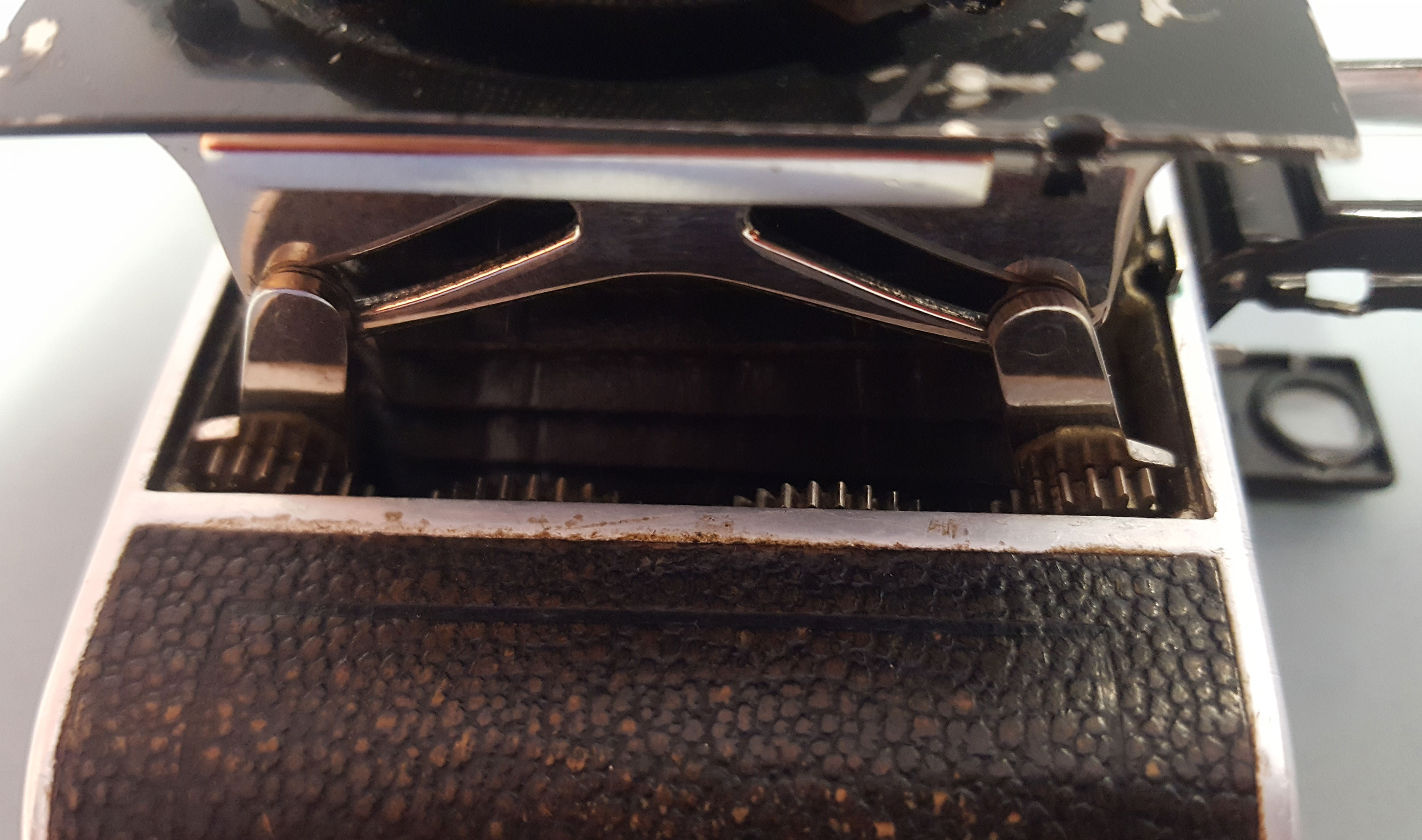 Im geöffneten Zustand bietet sich ein interessanter Einblick in den Zahnradmechanismus, der eine parallele Führung der Frontplatte garantieren soll: