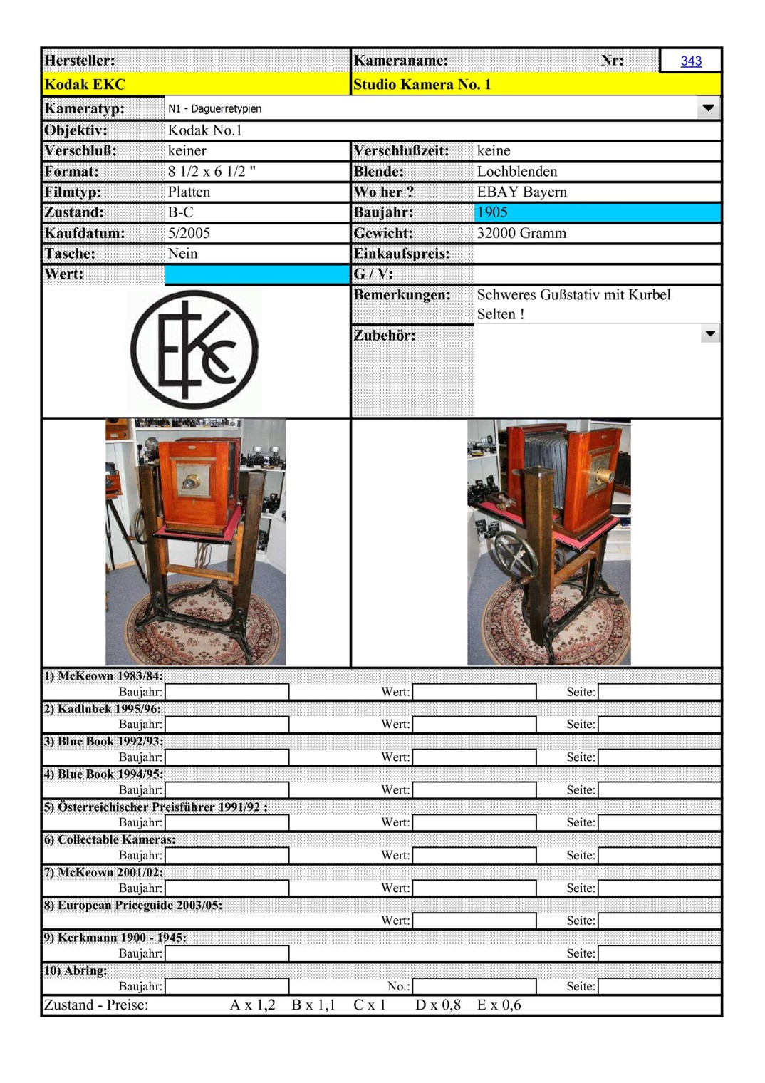 Hallo Markus, wenn es dann fertig ist, komme ich gerne mal vorbei, um mir Deine Sammlung mal Live anzusehen. Ich bin z.Zt. so bei 200 Stück. Mein Ziel ist es, so zwischen 200-300Stück zu bleiben. Ich probiere mich, auf Holzplattenkameras, Stereokameras und alle, die mir irgendwie Gefallen oder Ausgefallen sind, zu beschränken ;-) Das Blöde ist, daß ich andauernd etwas finde, was mir gefällt ;-) Einige meiner Kameras brauche ich hier gar nicht mehr vorzustellen, das hast Du schon übernommen, aber so einige Schätzchen werde ich hier schon noch Zeigen:-)