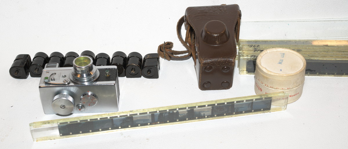 Wesentlicher Grund für diese Miniaturisierung war der in Japan nach 1945 drückend hohe Filmpreis. Amateure haben deshalb einige Mühe auf sich genommen: in der Dunkelkammer zu konfektionierender 16mm-Film, Füllen in wiederverwendbare Kassetten. Interessant mag deshalb sein, wie die Ausrüstung eines engagierten Amateurs aussah, besonders die Diastreifen, beidseitig in Glas montiert; Farb-und SW-Dias, hier von 1962.