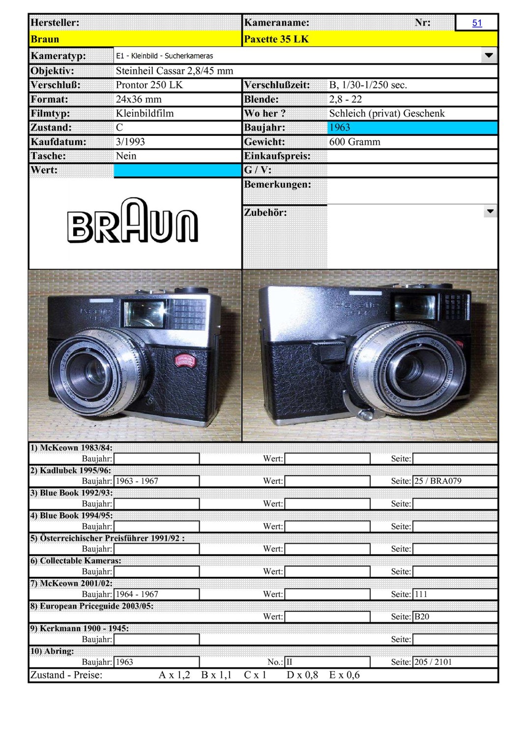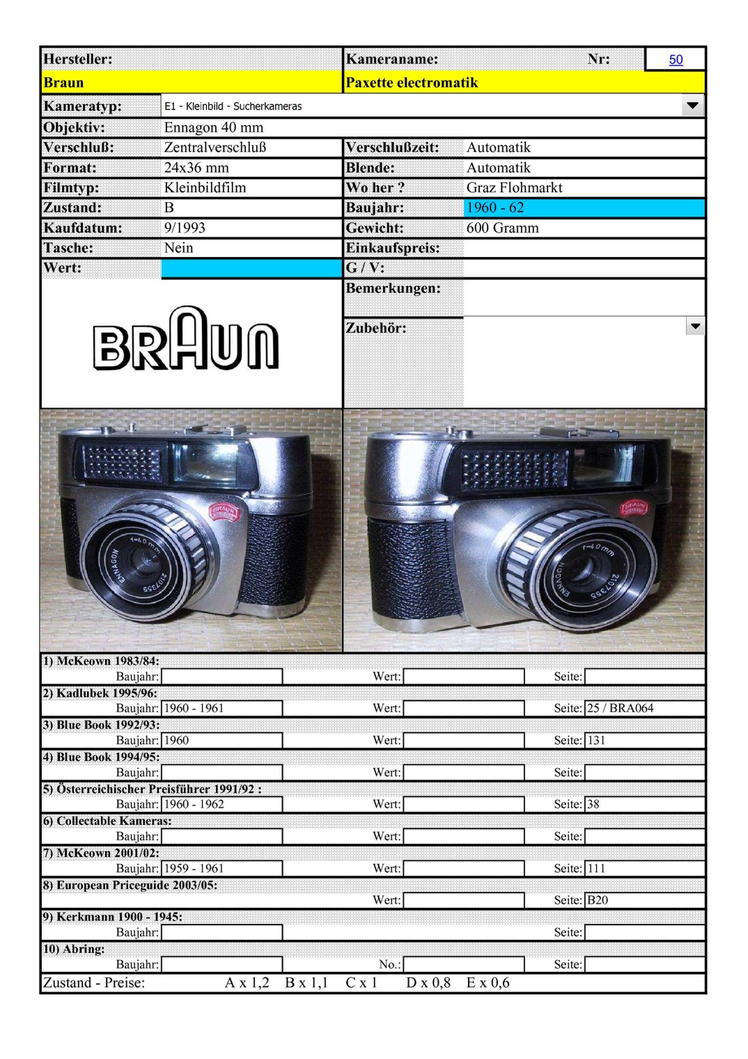 Hatte die Braun Paxette Electronik I, wie sie auf deinem Bild zu sehen ist, wirklich "Automatische Verschlußzeitsteuerung" ? Soweit mir bekannt ist, hatte sie nur eine feste Verschlußzeit von 1/40 Sekunde und dazu noch Fixfokus. Erst beim Modell II war die Entfernungseinstellung möglich.