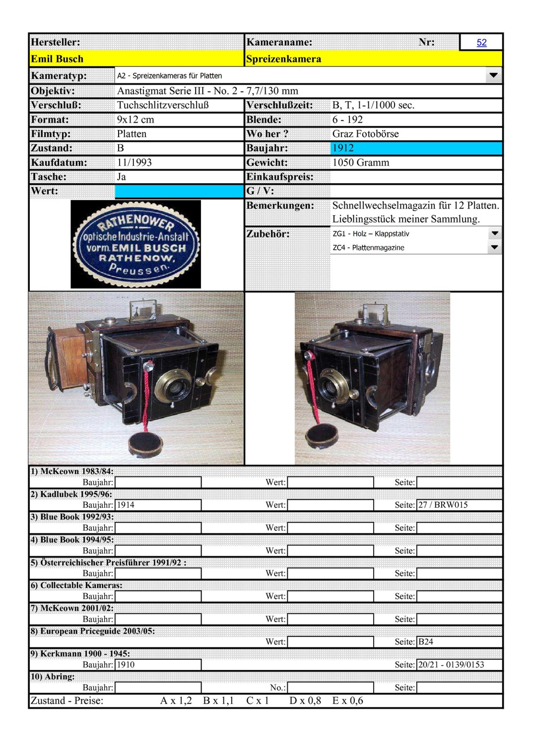 Könntest du die Kamera von Emil Busch Rathenow in der Rubrik "Plattenkameras" im Detail vorstellen (Technische Daten, Detailphotos - z.B. Schlitzverschluß, Zeiteinstellung, Plattenwechselmagazin, etc.)?