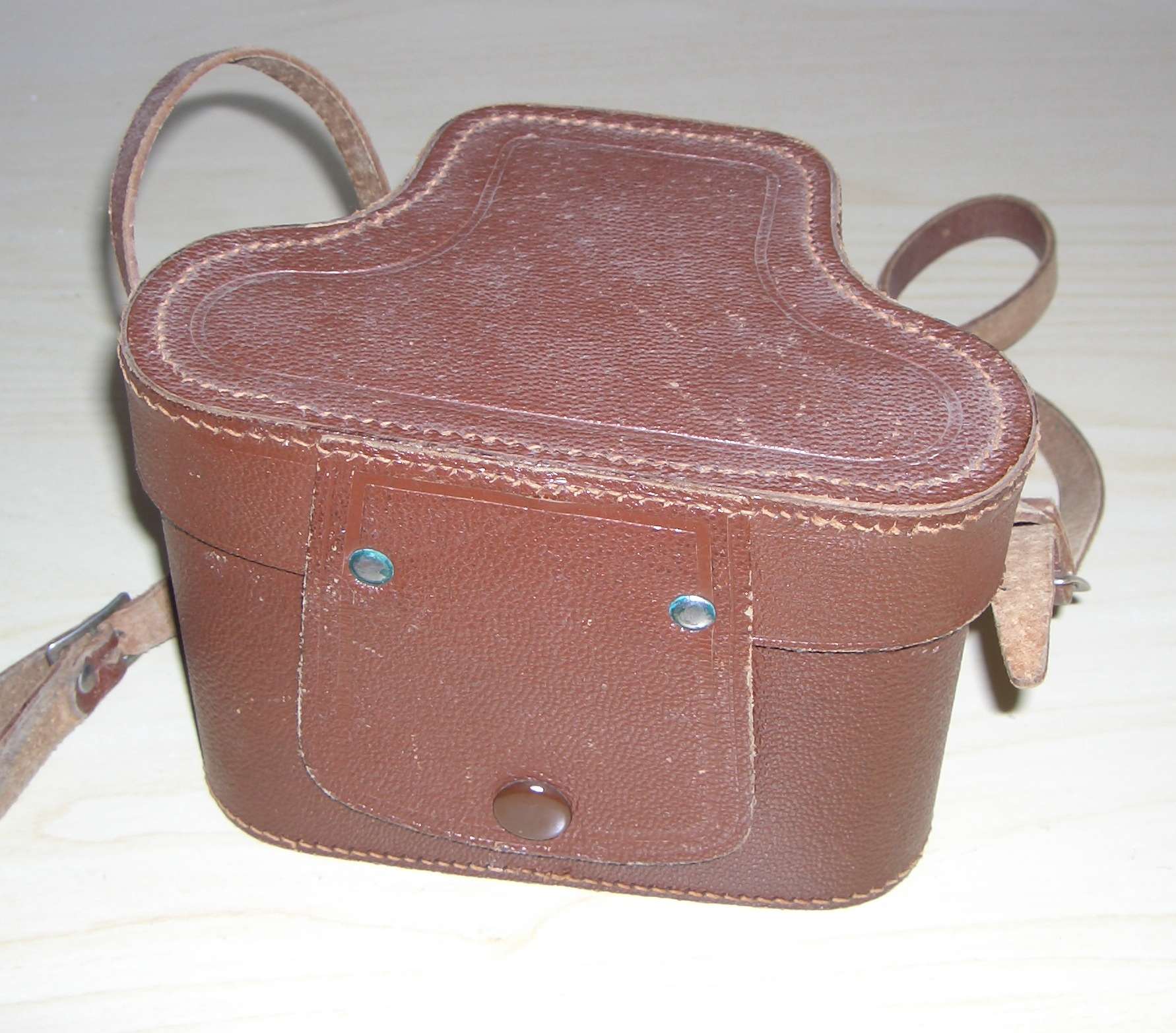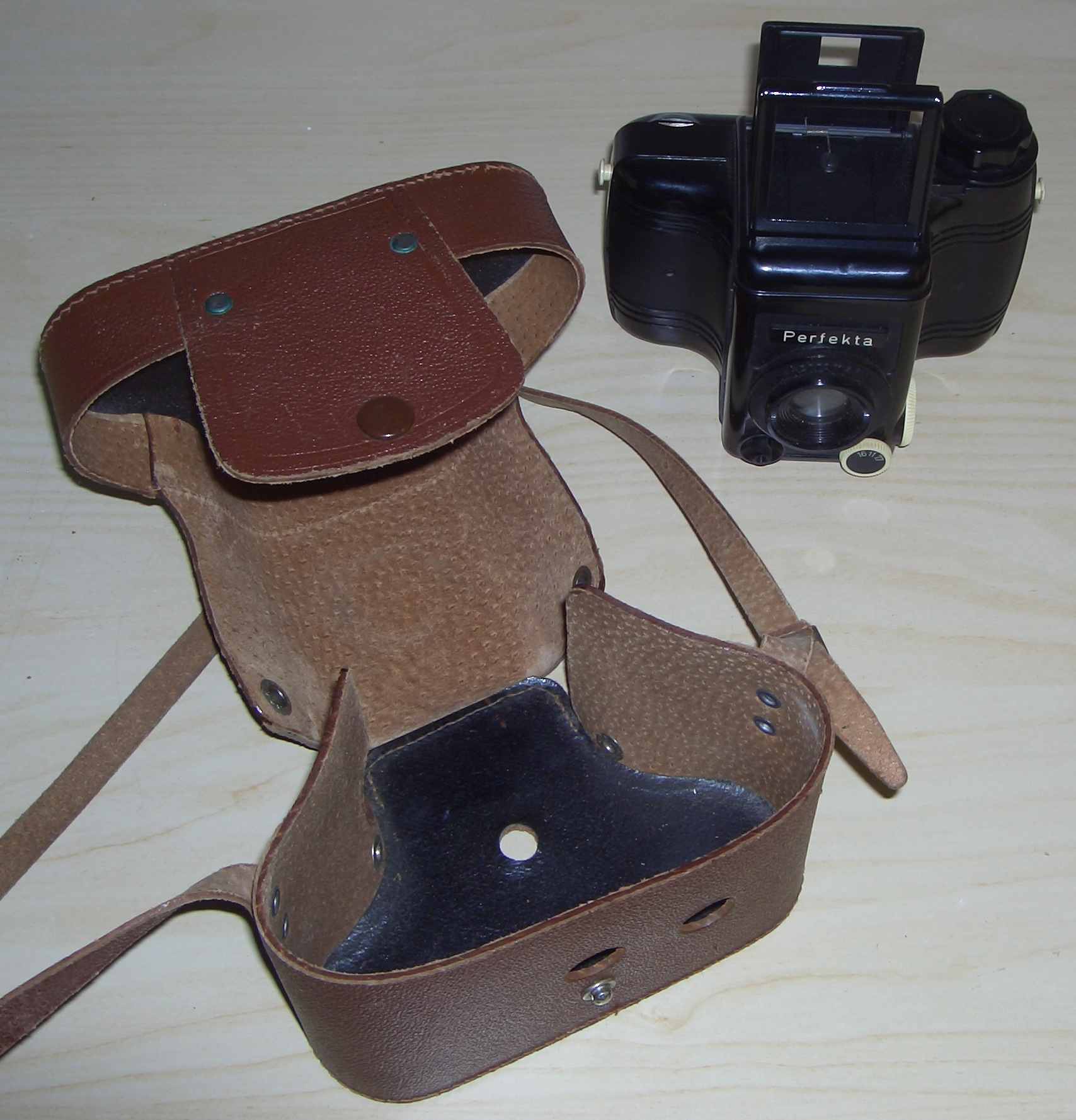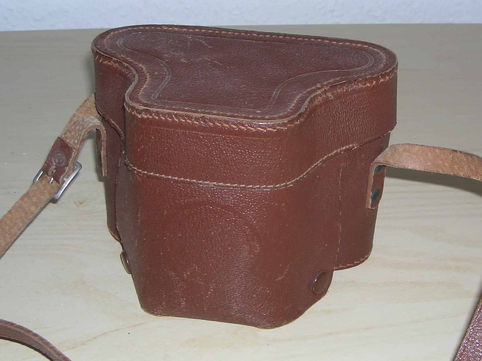 Die Tasche ist glaube ich nicht aus echtem Leder kann mich aber auch irren , vom "Anfaßfaktor" würde ich sagen Kunstleder. Meine habe ich mal aus einer Klappkiste mit 95% billigster Plastikkameras rausgesucht auf dem Flohmarkt. Leider findet man immer weniger interessante Sachen auf dem Flohmarkt oder in Geschäften.