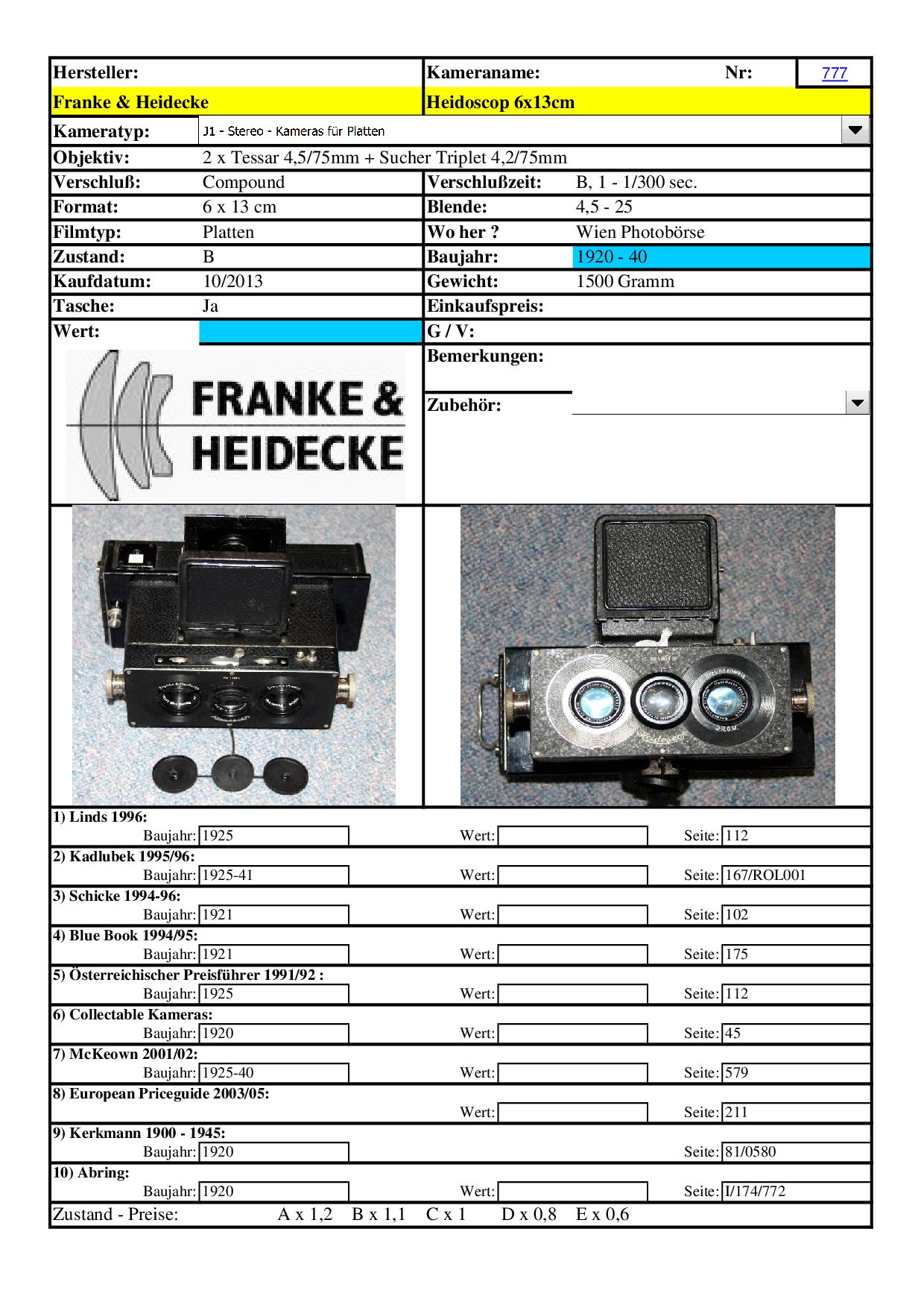 eine kleine Ergänzung: Das Heidoscop 6x13, erstmals 1925 im Programm, wurde im Laufe des Angebotszeitraums bis 1940 mehrmals überarbeitet; daraus ergeben sich nach Prochnow vier Modelle. Beim gezeigten Exemplar handelt es sich um das dritte Modell (gebaut 1927–31, Prochnow PR 013); Merkmale sind u.a. Blendeneinstellung auf der Oberseite, Verstellung der Front durch Verschiebung statt durch Stellschraube, neuer Lichtschacht ohne Emblem. Der Verschluss arbeitet mittels Luftbremse; es handelt sich aber nicht um einen Compound, wie oft zu lesen, sondern – wie bei allen Heidoscopen – um einen von F & H selbst konstruierten Verschluss.