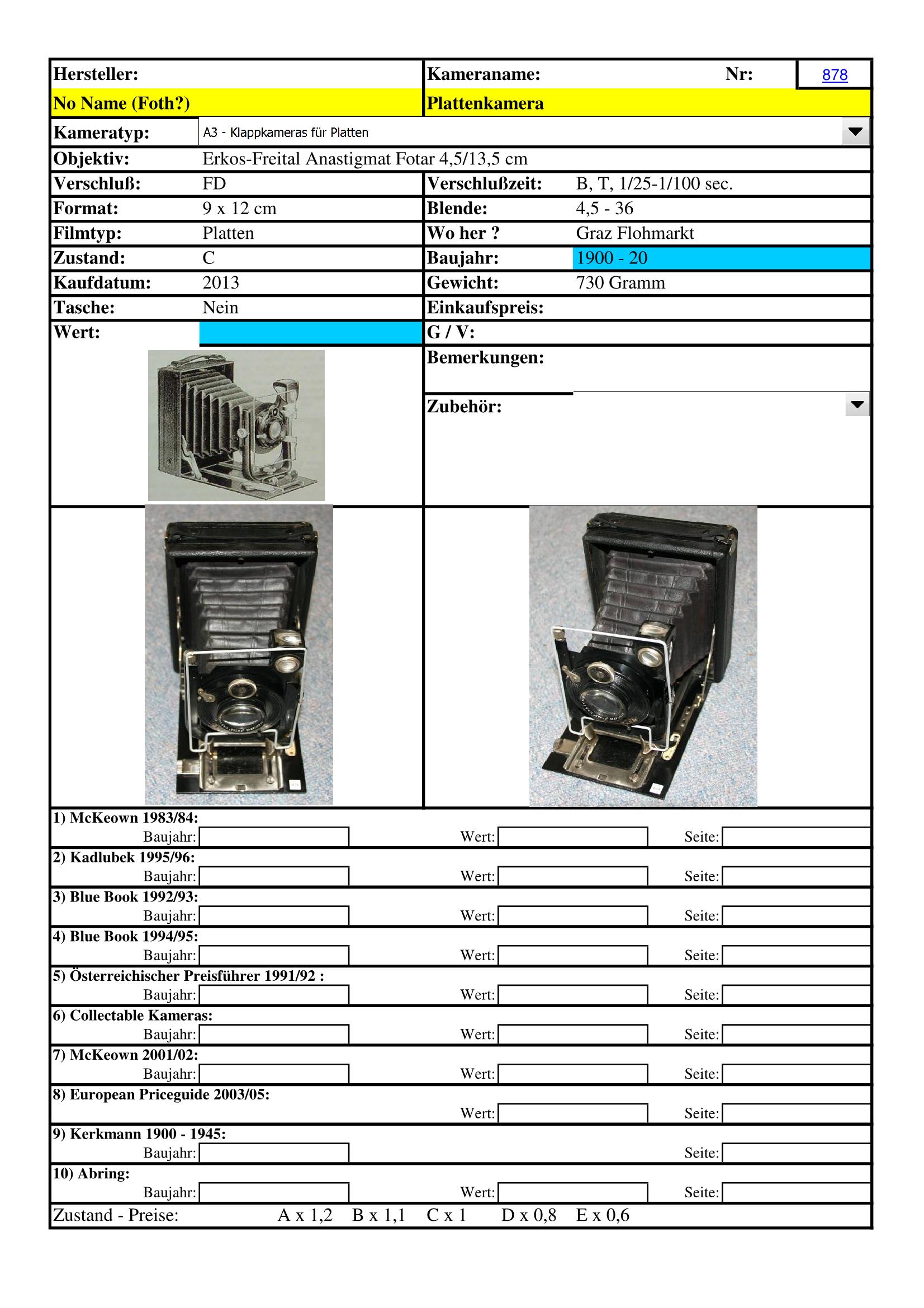 Das Fotar wurde nicht nur für Beier- und Erkos-Kameras verwendet. Vielleicht war das Fotar tatsächlich ein Objektiv von Erkos. Im Vademecum erscheint Erkos ja auch, aber nur mit einem einzigen Objektiv, dem Selar. Das erhärtet keineswegs den Verdacht, daß Erkos auch Objektive hergestellt hat. Von Beier, gegründet 1923, ist einiges bekannt, siehe http://www.dresdner-kameras.de/ und <a href="http://www.beier-kamera.de" target="_blank">http://www.beier-kamera.de</a></a> , von Erkos sehr wenig und von Foth dem Anschein nach auch nicht viel. Überraschenderweise erwähnt die erste Referenz Erkos aber überhaupt nicht, obwohl es sich zweifellos um eine Freitaler Firma handelt und Erkos sogar denselben Kameratischler hatte wie Beier (das weiß ich von einem Beier-Experten).. Fotare habe ich zwei, eins nach meiner schwankenden Meinung auf einer Foth-Laufbodenkamera, eines auf einer Hausmarkenkamera (vermutlich von Conrad A. Müller - hoppla - habe gerade ein Angebot gesehen, auf dem diese Kamera Balda zugeschrieben wird ...). Auf denen wird sonst kein Name erwähnt - weder Foth noch Erkos. Eine Aufschrift wie "Erkos Fotar" beweist übrigens nicht viel - es gab damals auch schon etliche Hersteller, die wie heutige OEMs wirkten.