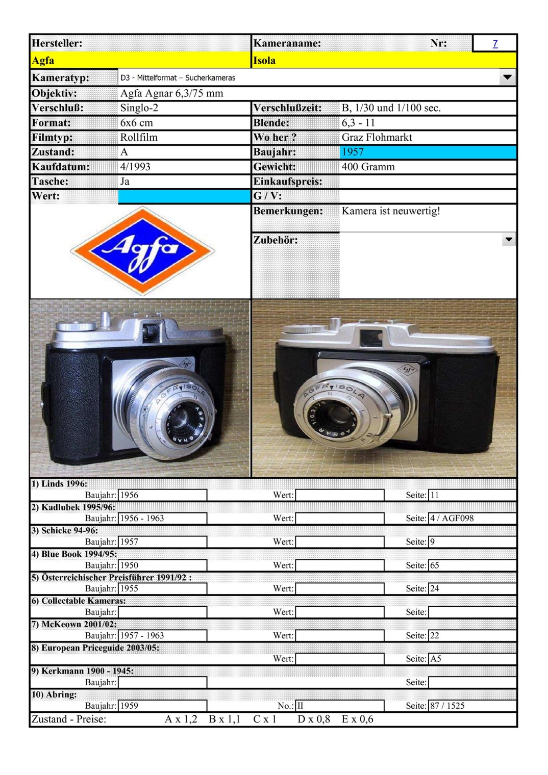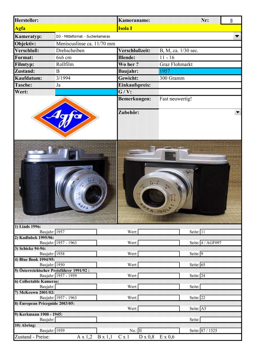 Sie hatte nur ein Meniscus als Objektiv; nicht weiter tragisch, wenn wir betrachten das diese eine billige Kamera war. Das Problem war das die Filmebene nicht gewölbt war (wie doch auf die Click I, z B) um dir Aberrationen des Meniscus zu kompensieren. Die Isola II wurde hier verbessert mit einem Agnar und einem besseren Verschluss
