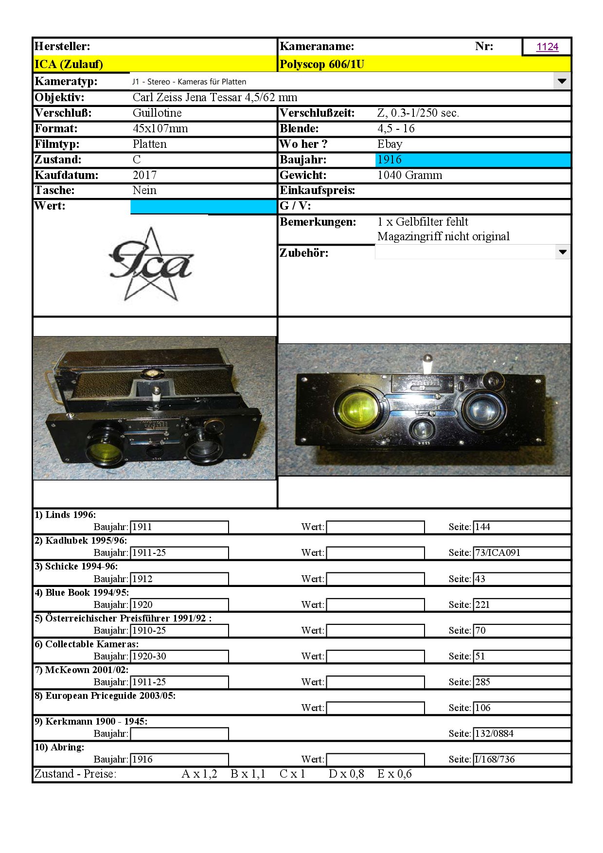 Zwei Indizien legen diese Einordnung nahe: 1. Auf der Front erkennt man unter dem 'Sucherauge' eine vierstellige Seriennummer. Bei Ica-Kameras folgten die Seriennummer einem Schema mit vorangestelltem Buchstaben und waren an versteckter Stelle (bei den Polyscopen: Rahmen des Bildfensters) angebracht. Außerdem waren Ica-Kameras als solche gekennzeichnet, was beim vorgestellten Exemplar nicht der Fall ist, soweit ich sehe. 2. Die Bestückung mit Tessaren der Brennweite 62mm ist bei den Ica-Modellen nicht dokumentiert (dort beträgt die Brennweite 65 mm). Näheren Aufschluss würden die Seriennummern der Tessare bieten.