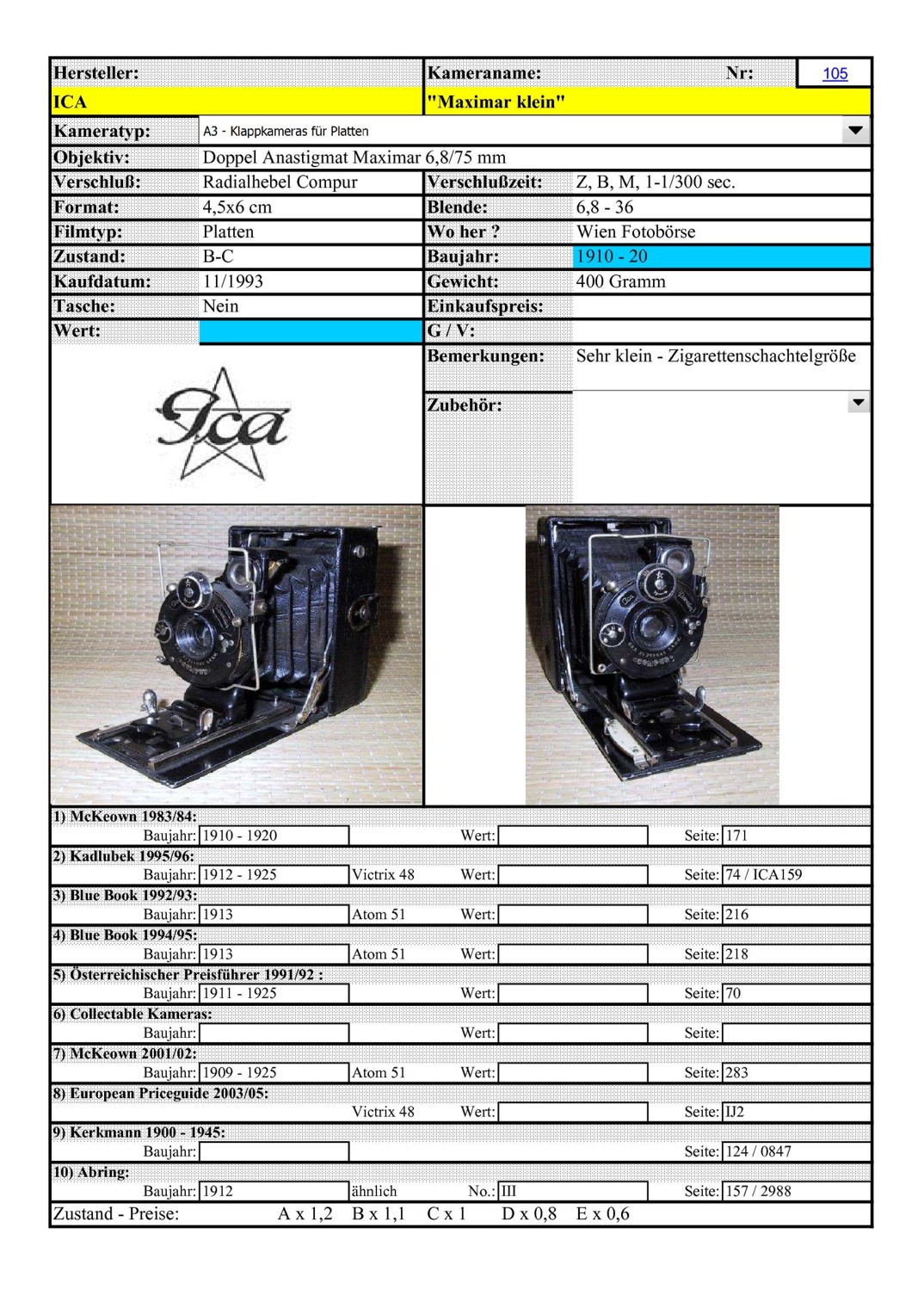 Die zweite Kamera ist auf keinen Fall eine Maximar, das kleinste Format dieser Modellreihe ist 6,5x9. Bei der gezeigten Kamera handelt es sich vielmehr um eine Victrix, und zwar um das Modelll 49 (––> https://blende-und-zeit.sirutor-und-comp...&thread=175).