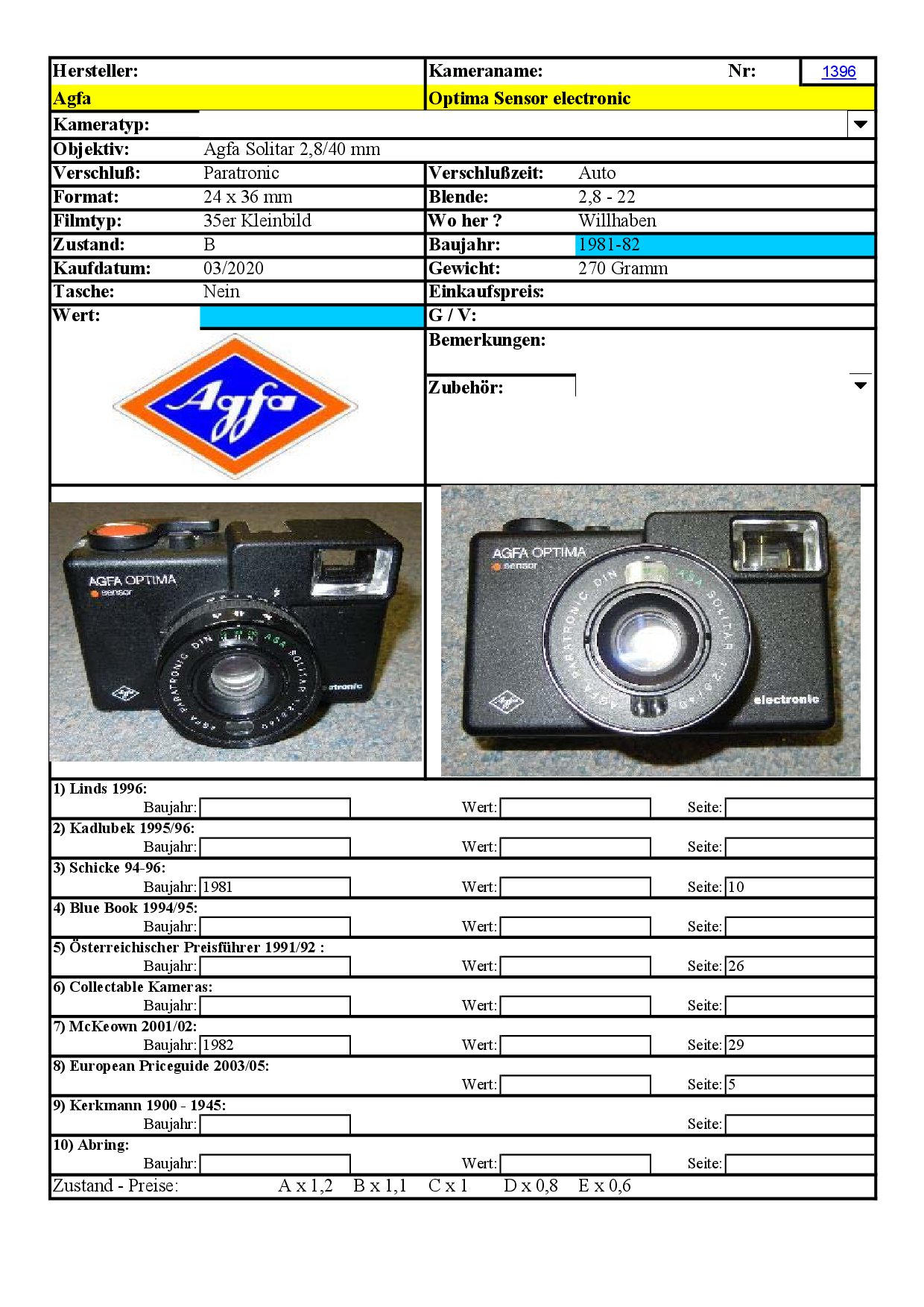 interessant, dass das hier gezeigte Modell keine Typennummer hat, sondern lediglich "". Es scheint sich aber eigentlich um das Modell mit Nummer "Agfa Optima Sensor 535 Electronic" zu handeln, wie hier im Forum vorgestellt: