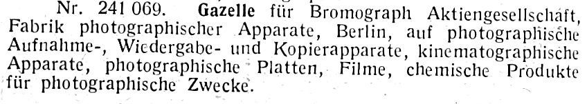 Eine Gazelle mit Bromograph-Objektiv hat der Sascha auch bereits hier im Forum gezeigt (https://blende-und-zeit.sirutor-und-comp...1&thread=70 ). Der Namensschutz belegt, dass die Gazelle von der Bromograph AG oder von einem unbekannten Betrieb für die Bromograph AG hergestellt wurde. Die Kamera sollte deshalb unter der Bromograph AG im Verzeichnis eingeordnet werden.